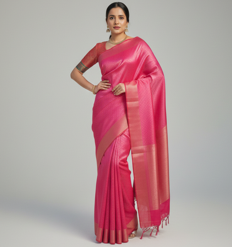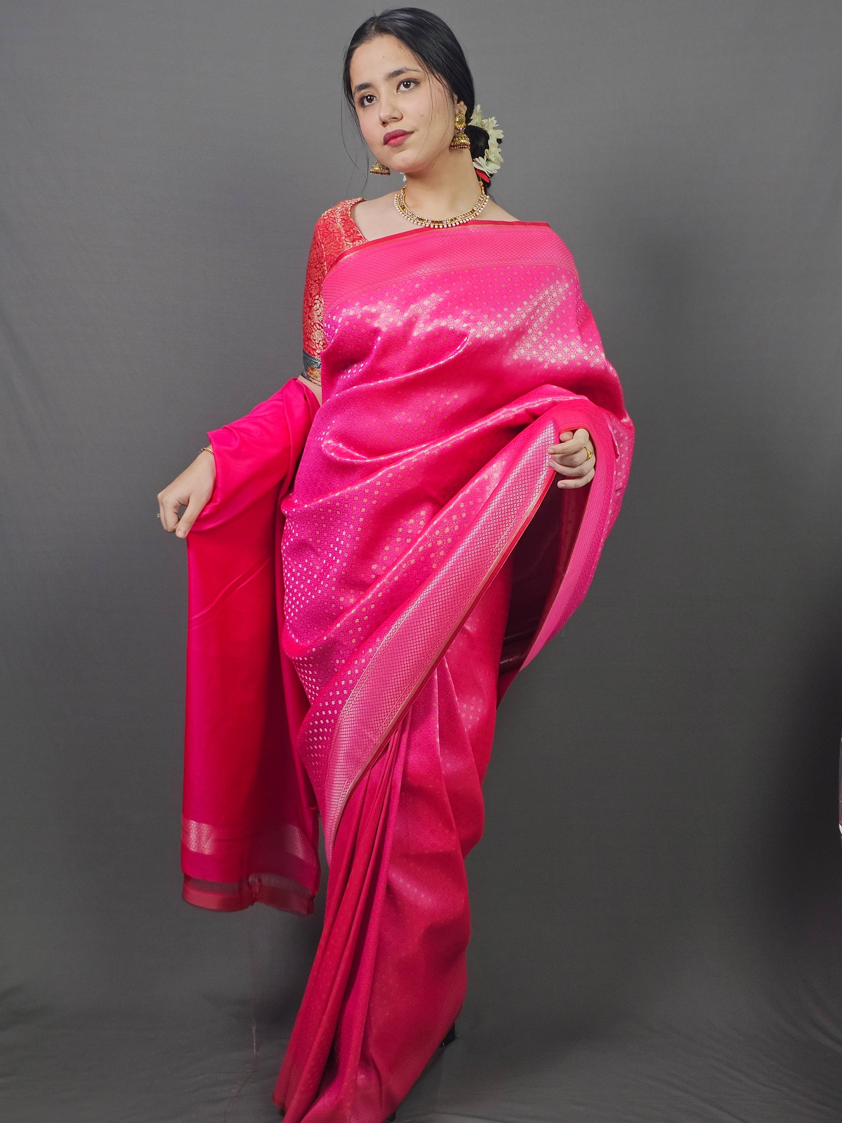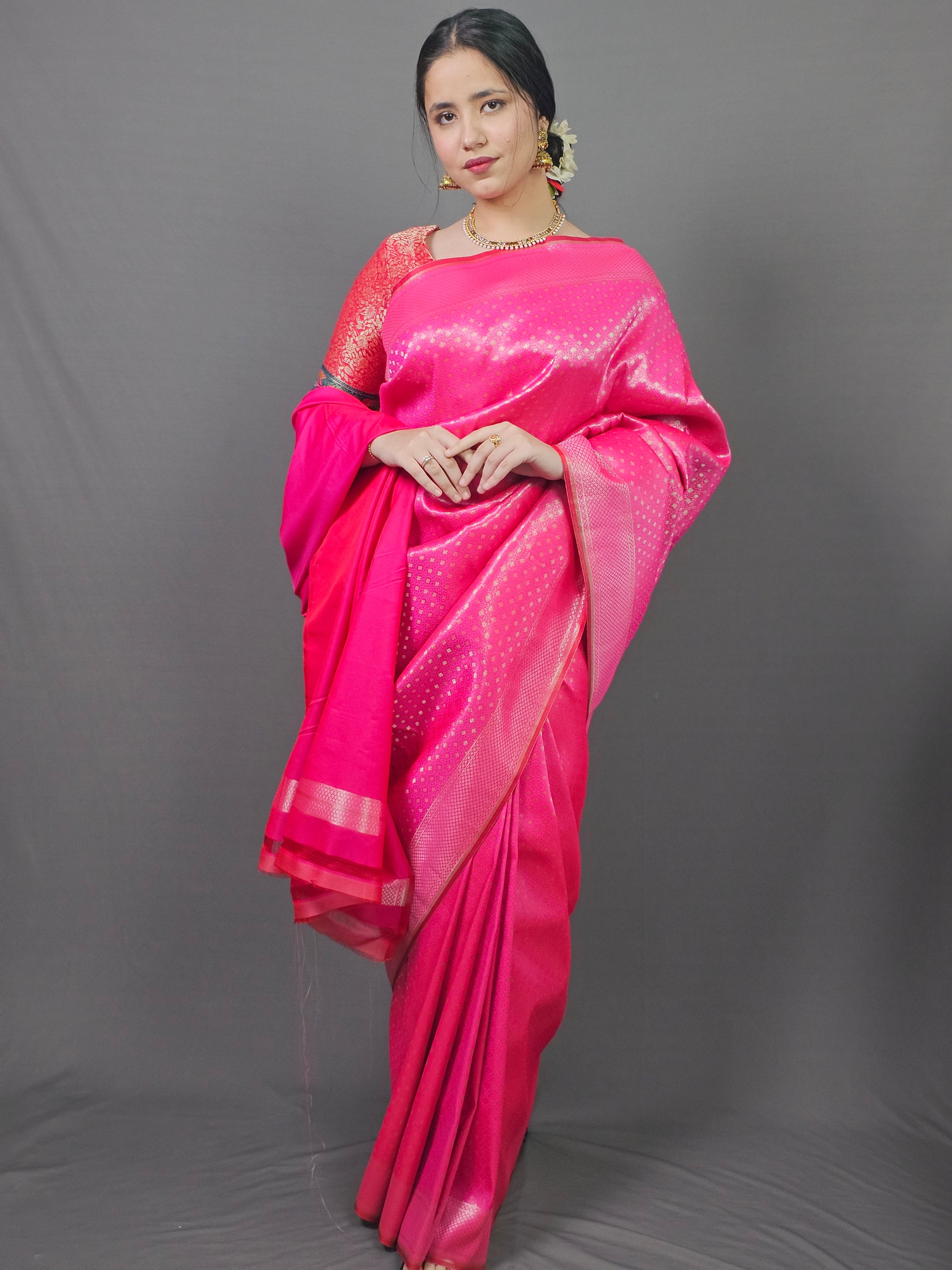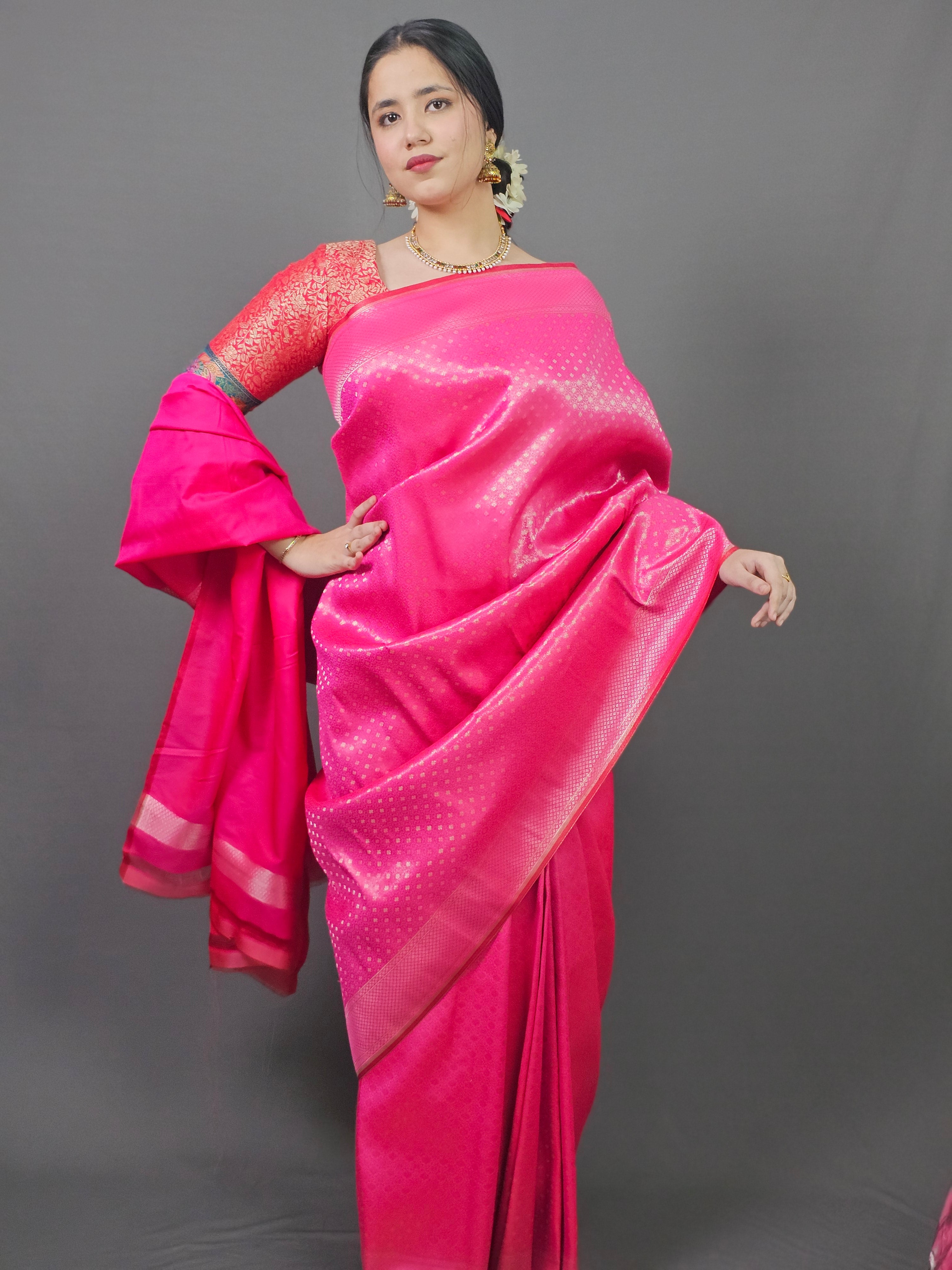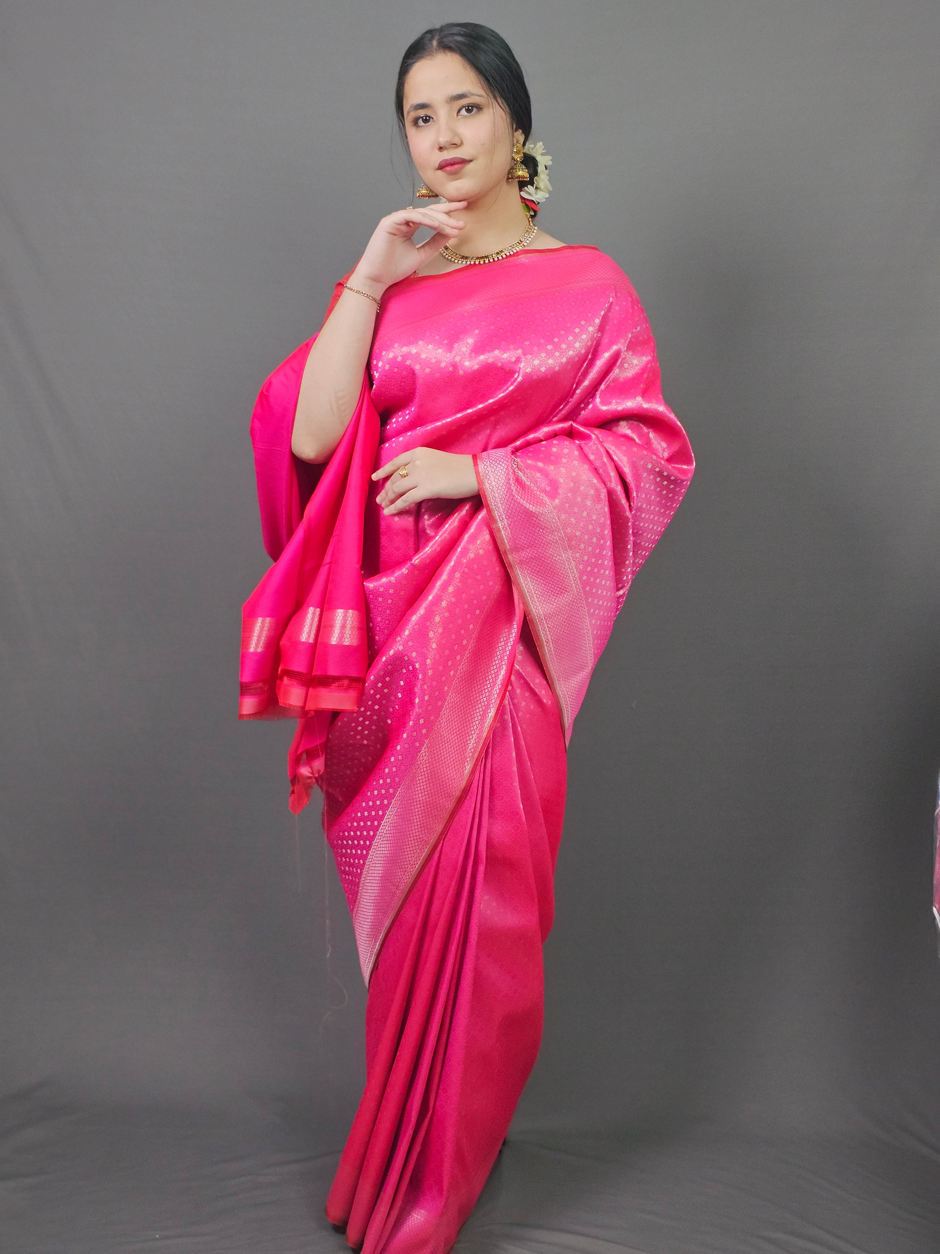 Pure Banarasi silk drapes like liquid celebration, the powerloom creating intricate woven patterns that shimmer with every movement. Lightweight enough for hours of comfort, luxurious enough to turn heads. The rich hot pink body flows into a magnificent border and pallu where traditional zari work creates a mesmerizing play of light—this is heritage craftsmanship that speaks without words.