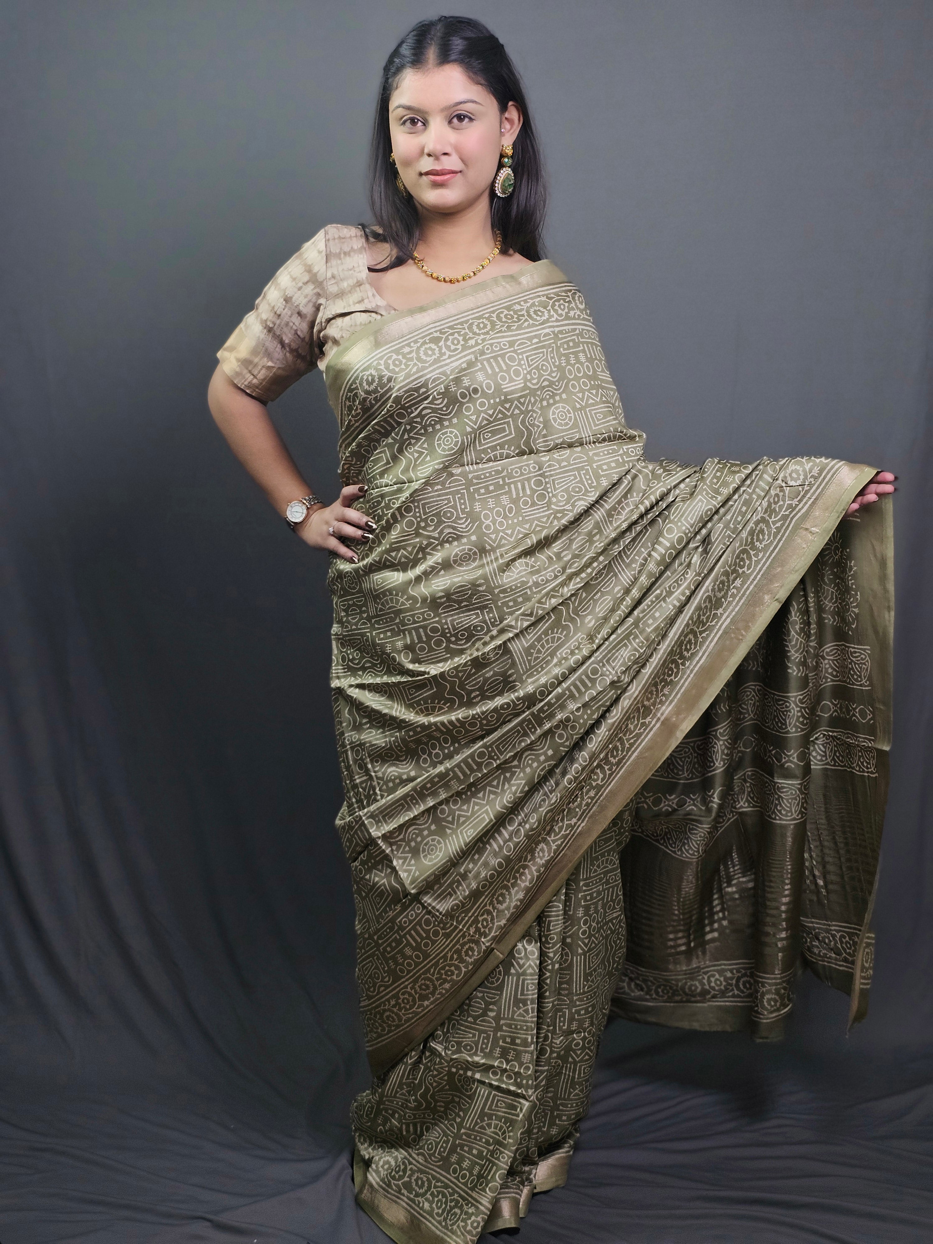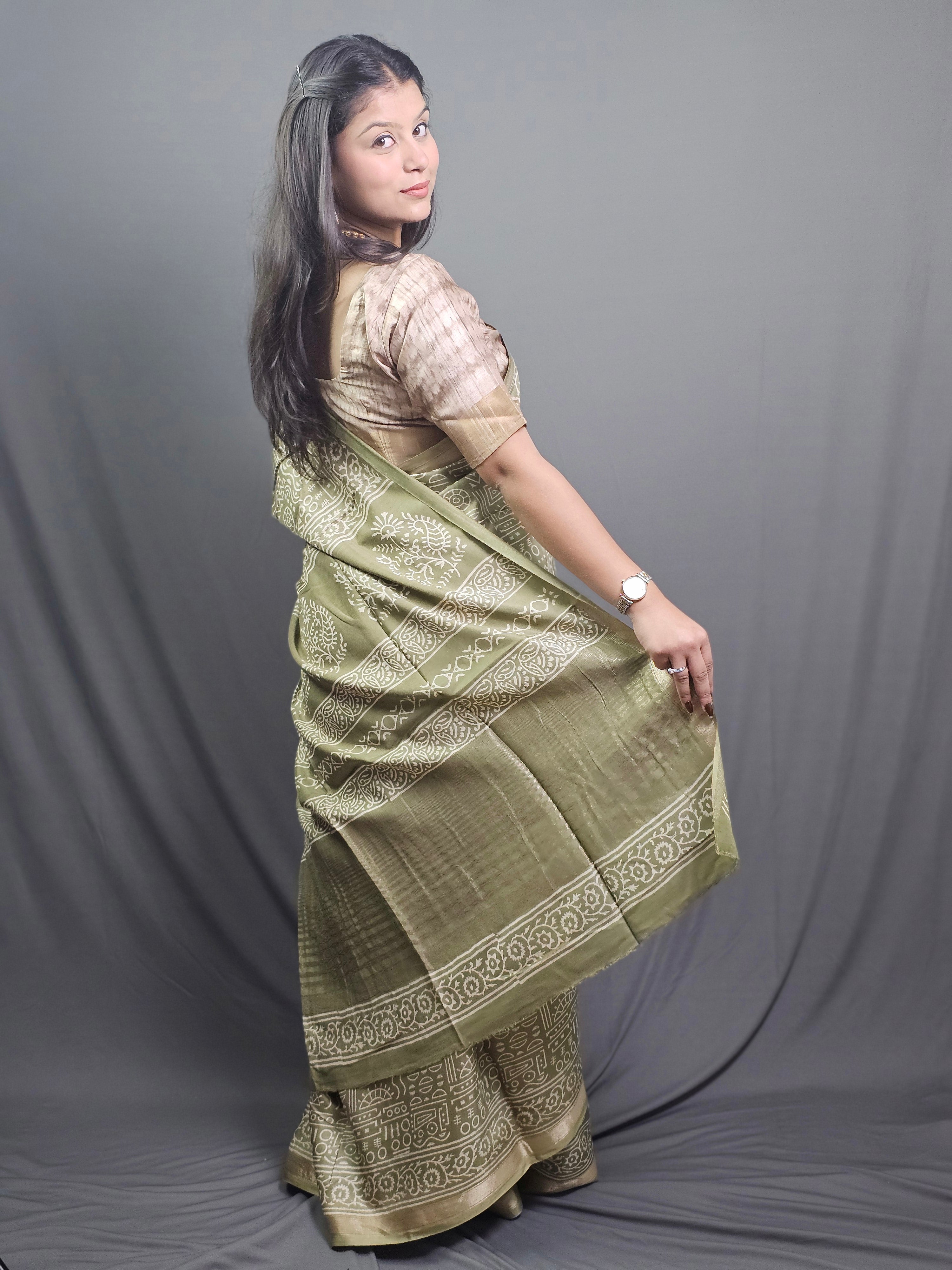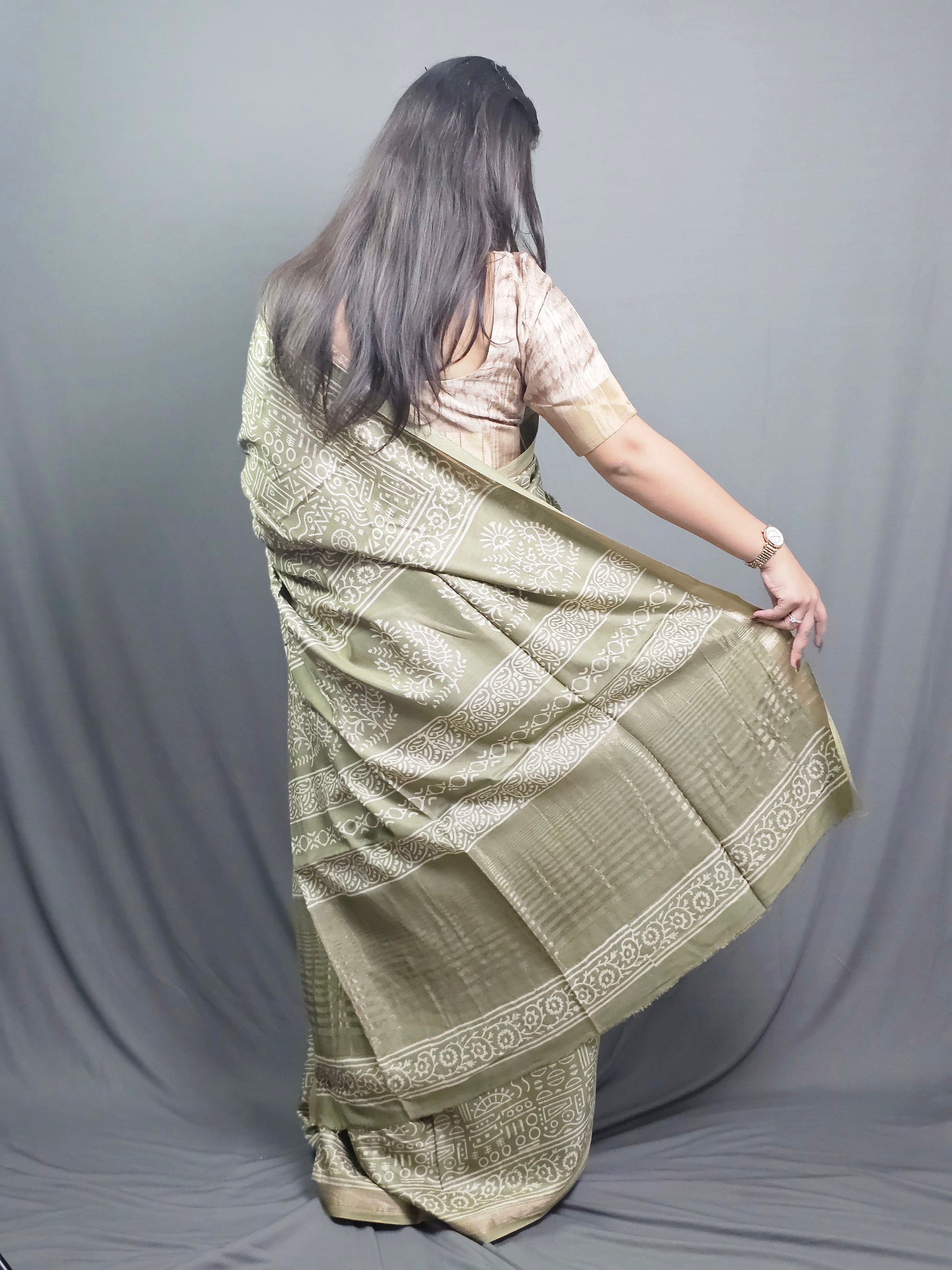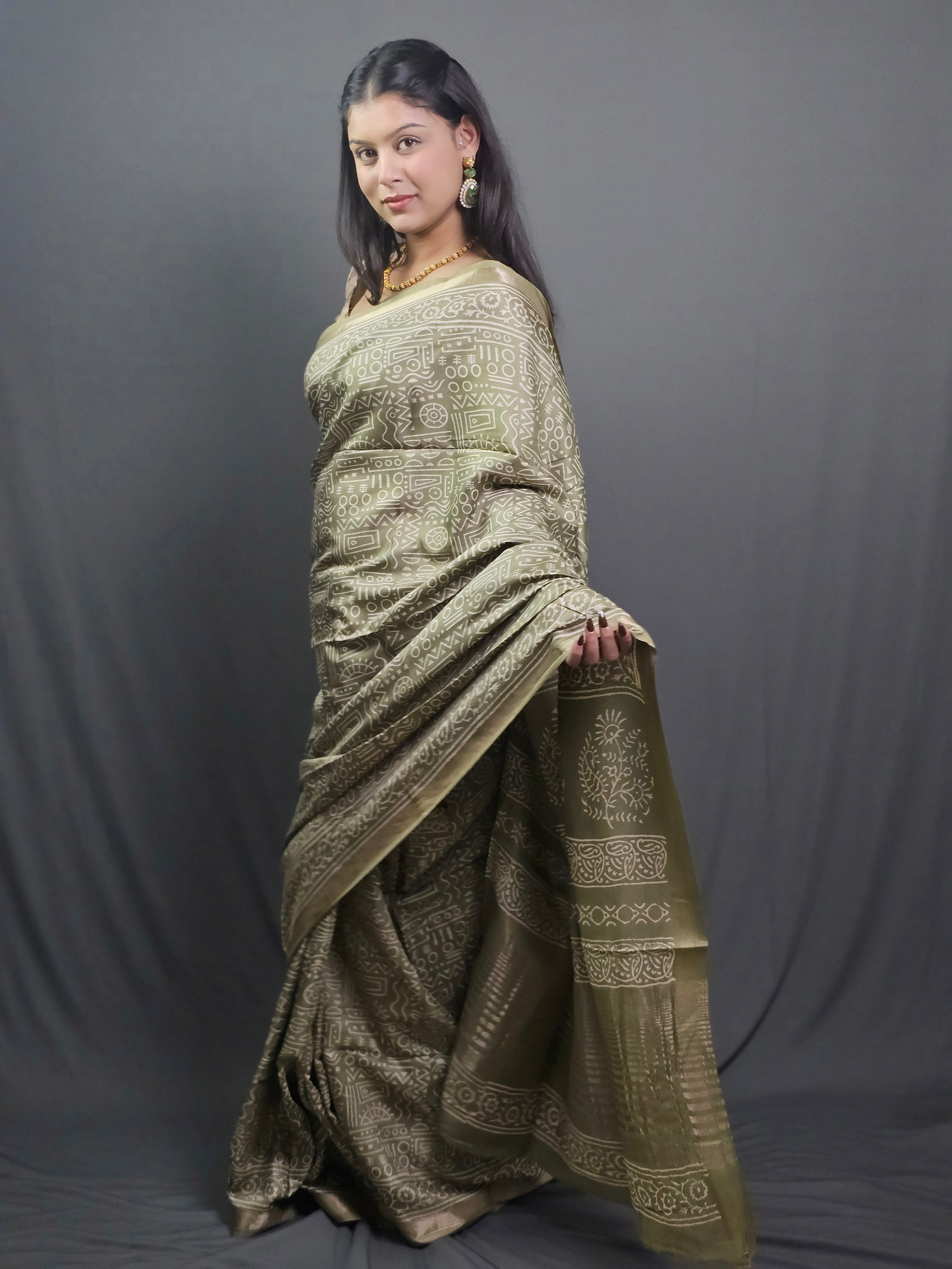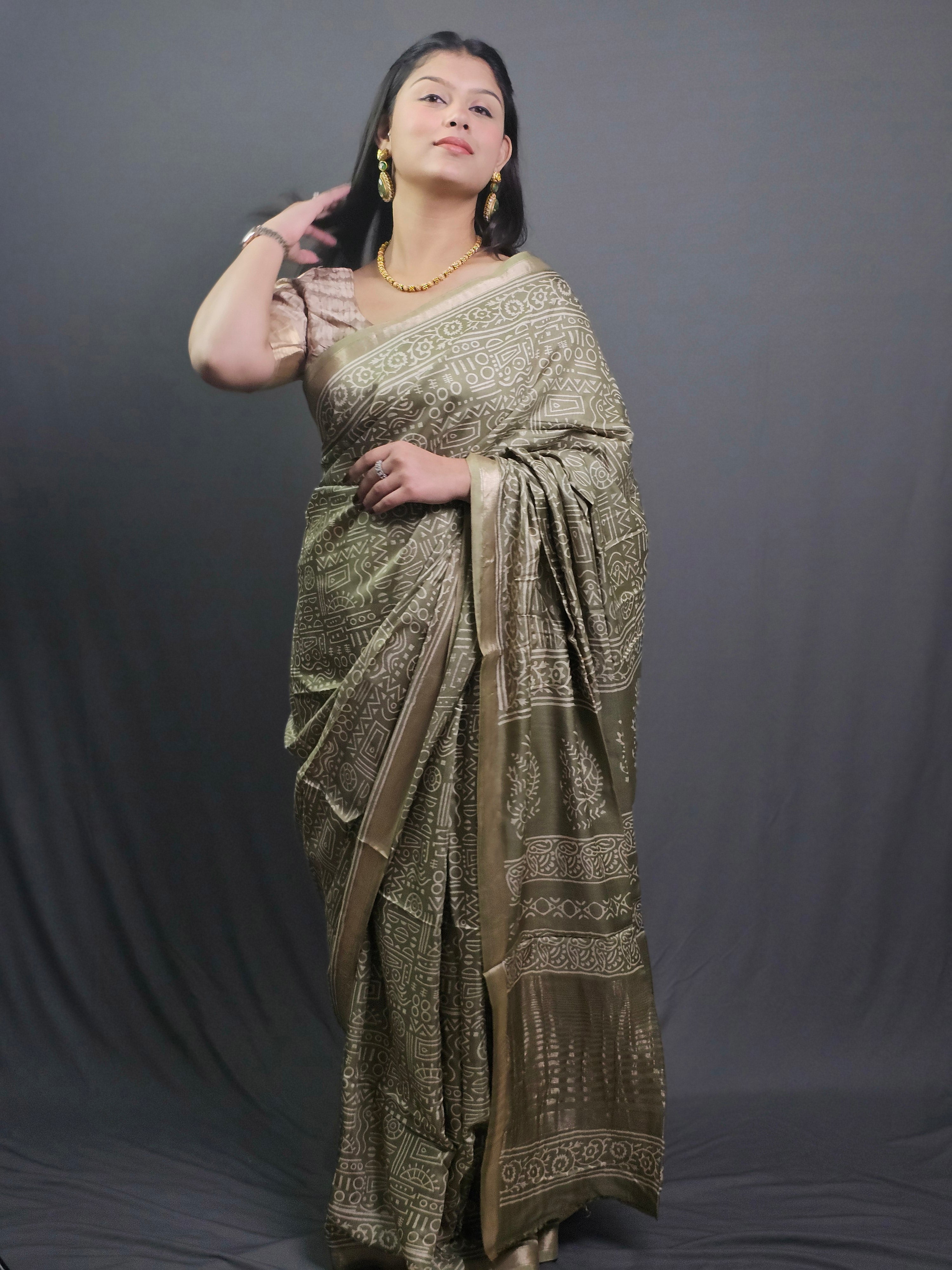 This saree reflects nature’s eternal abundance—green represents growth, harmony, and the lush forests of Vrindavan where Krishna wandered among sacred groves and tulsi plants. The olive-green tone feels grounding and calm, inviting a sense of balance, steadiness, and inner peace. It is a color that connects the wearer to the earth while keeping the spirit uplifted.