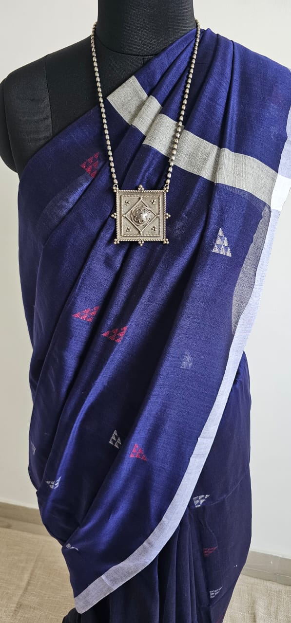 Grace meets simplicity in this exquisite navy blue handwoven saree, adorned with delicate geometric threadwork motifs in soft hues of...