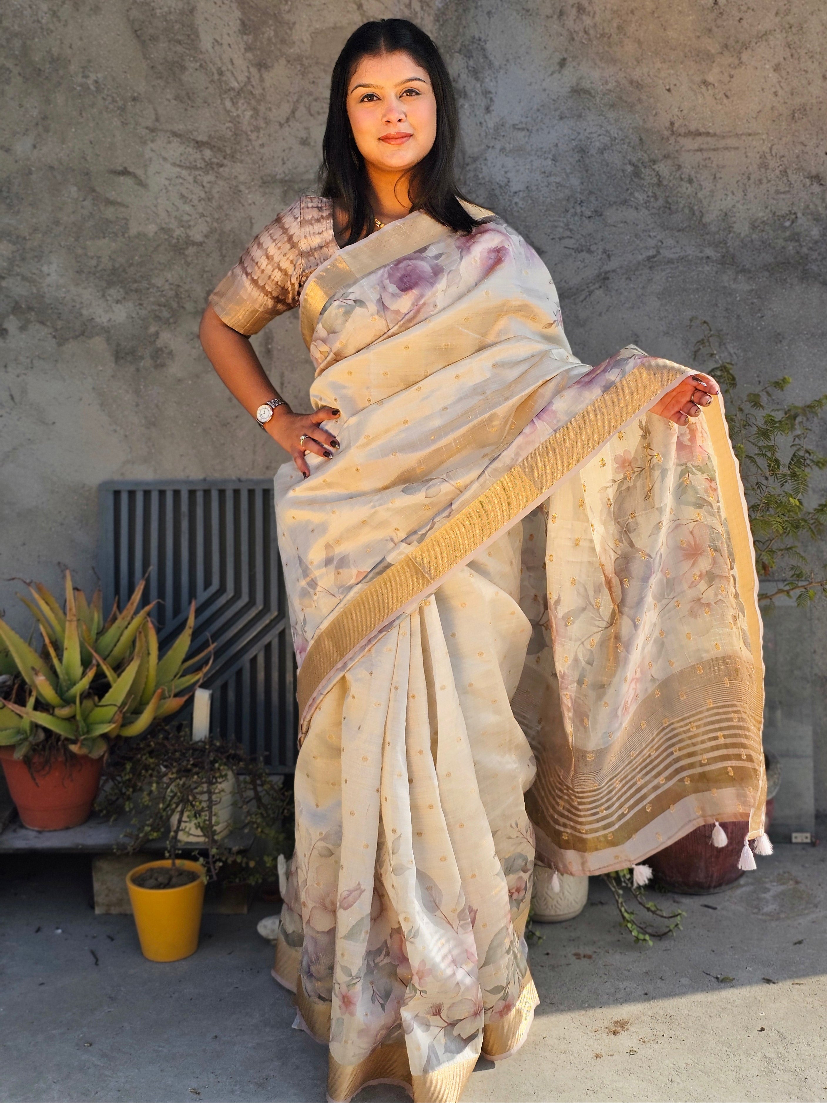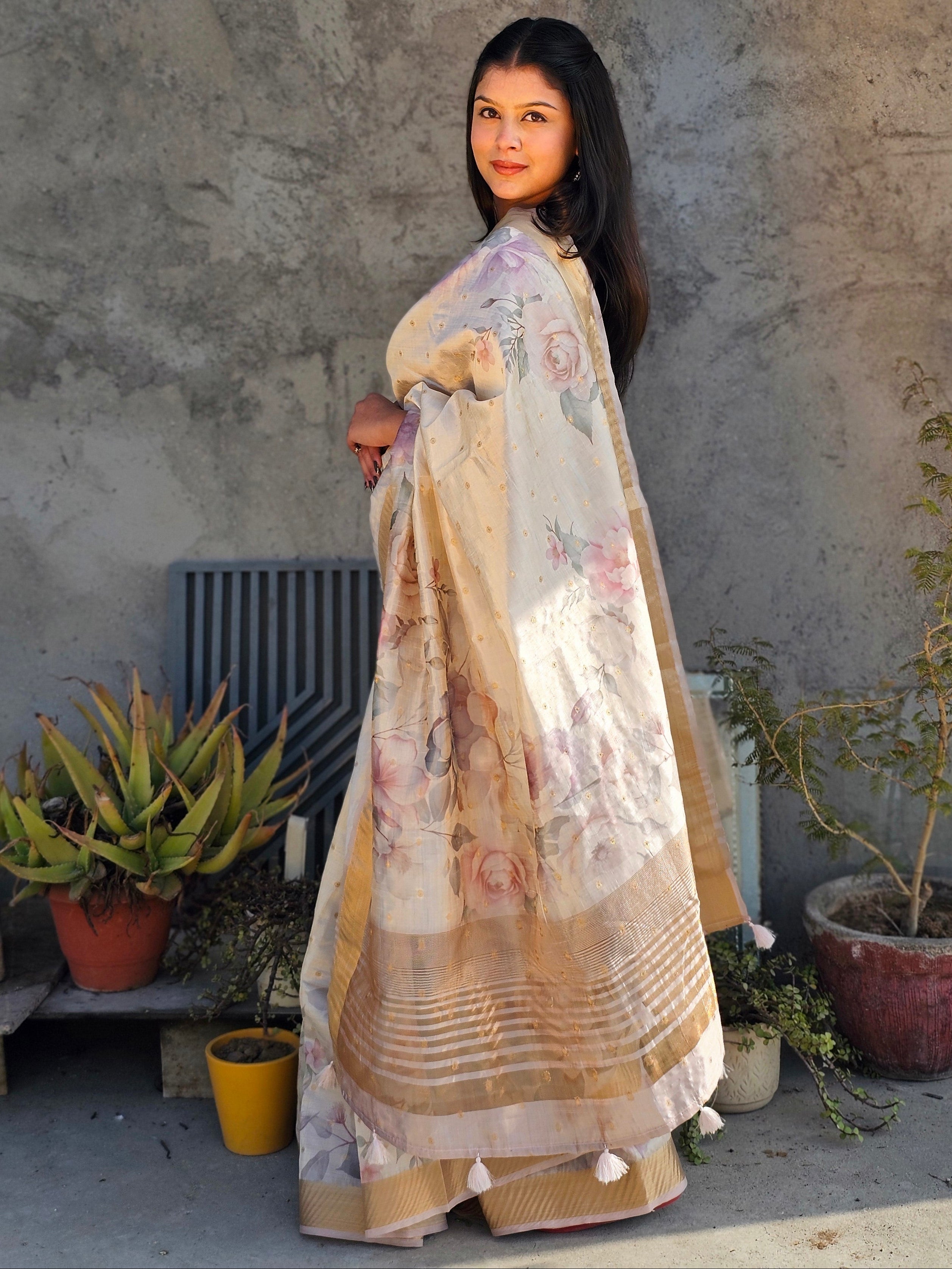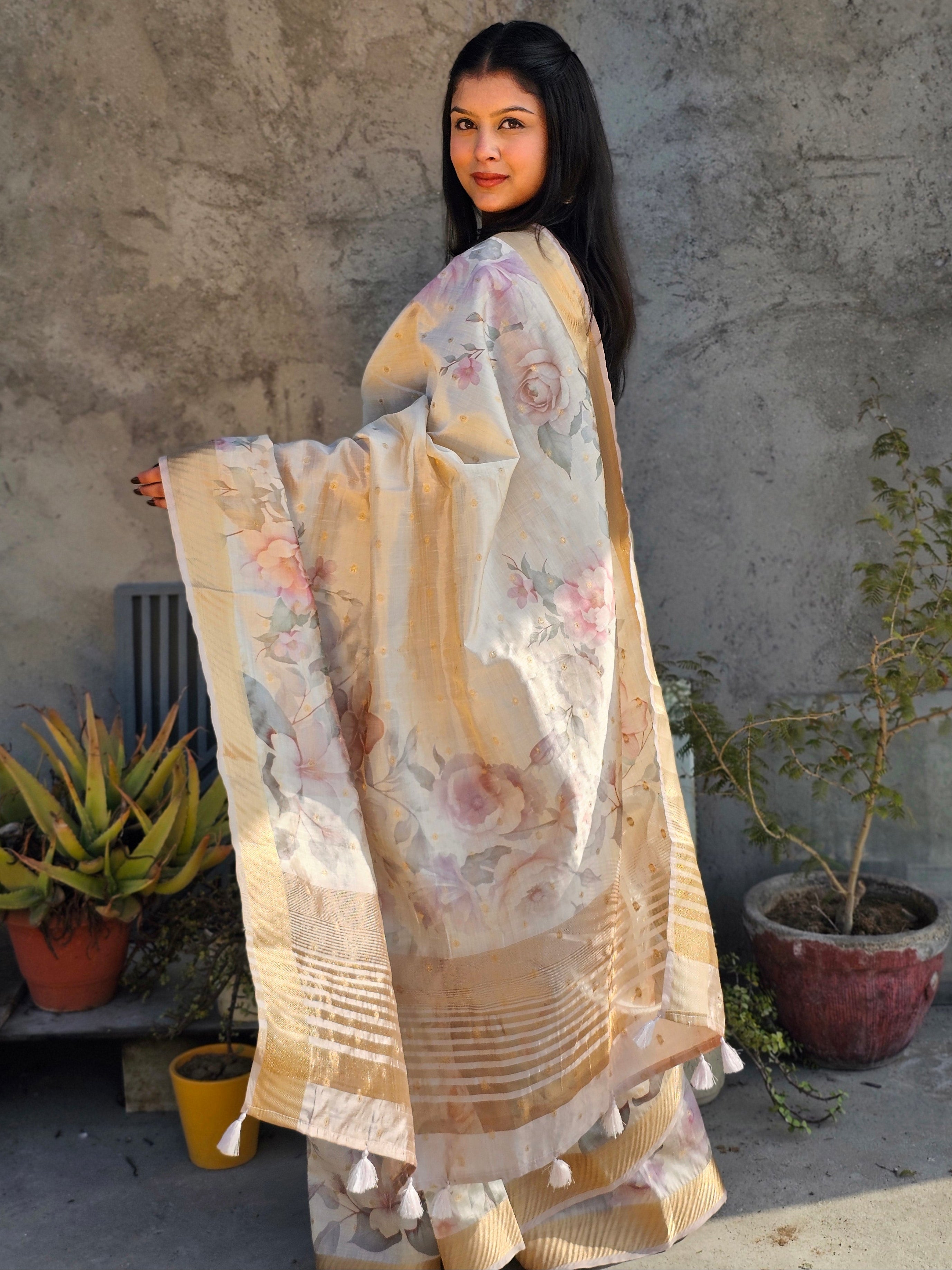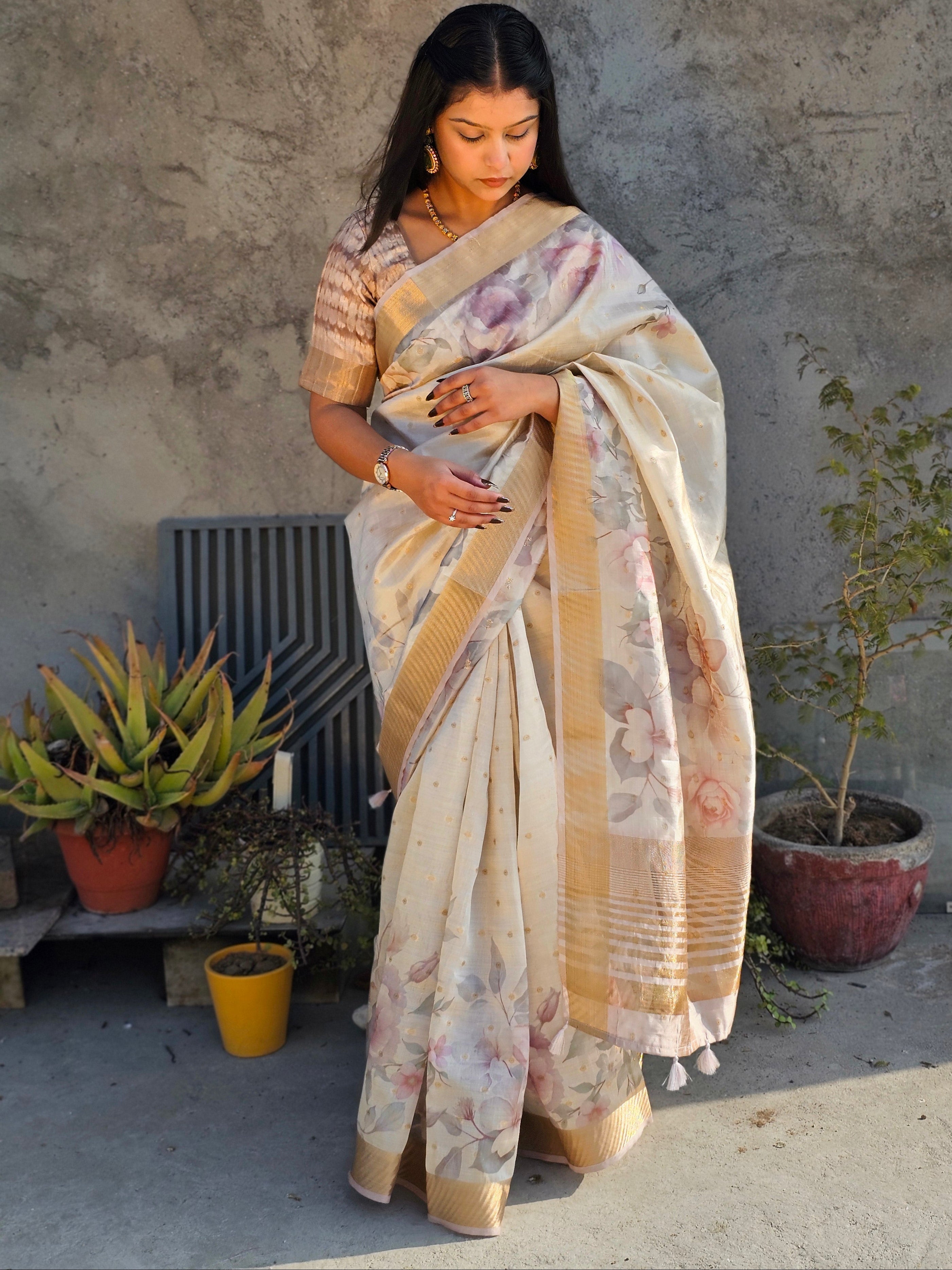 Embrace timeless grace with this beautiful Semi Tussar Silk saree, designed for women who love subtle luxury and effortless elegance. The soothing ivory-beige base is adorned with delicate pastel floral prints, giving the saree a soft, feminine, and refreshing look—perfect for both day functions and graceful evenings.