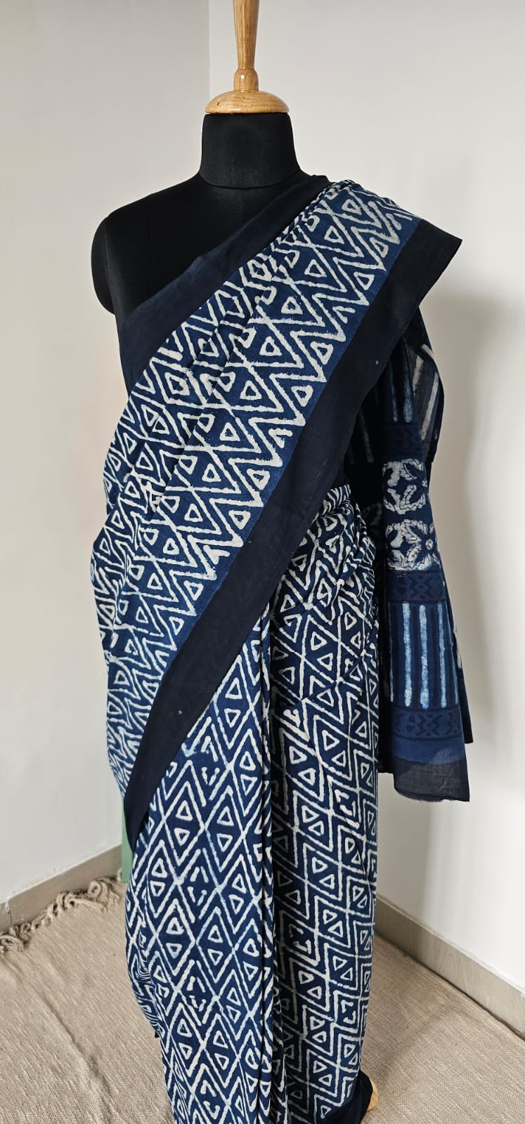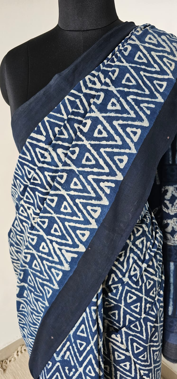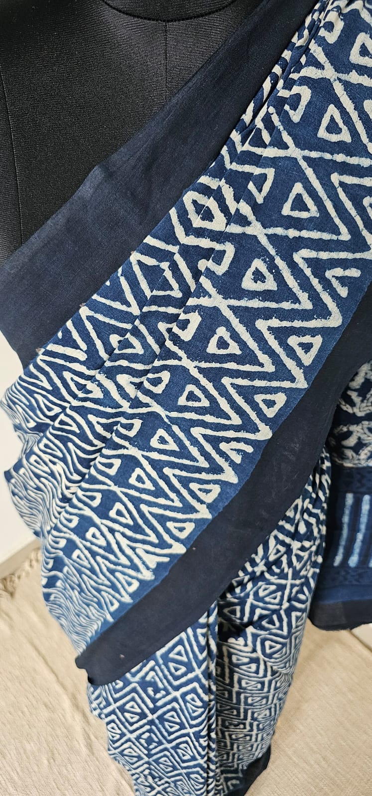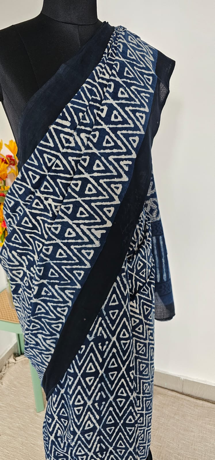 The deep blue base creates a bold contrast with the triangular and zigzag block prints, giving it an earthy yet contemporary appeal. A solid indigo border finishes the piece with grace, making it suitable for both everyday wear and cultural gatherings.