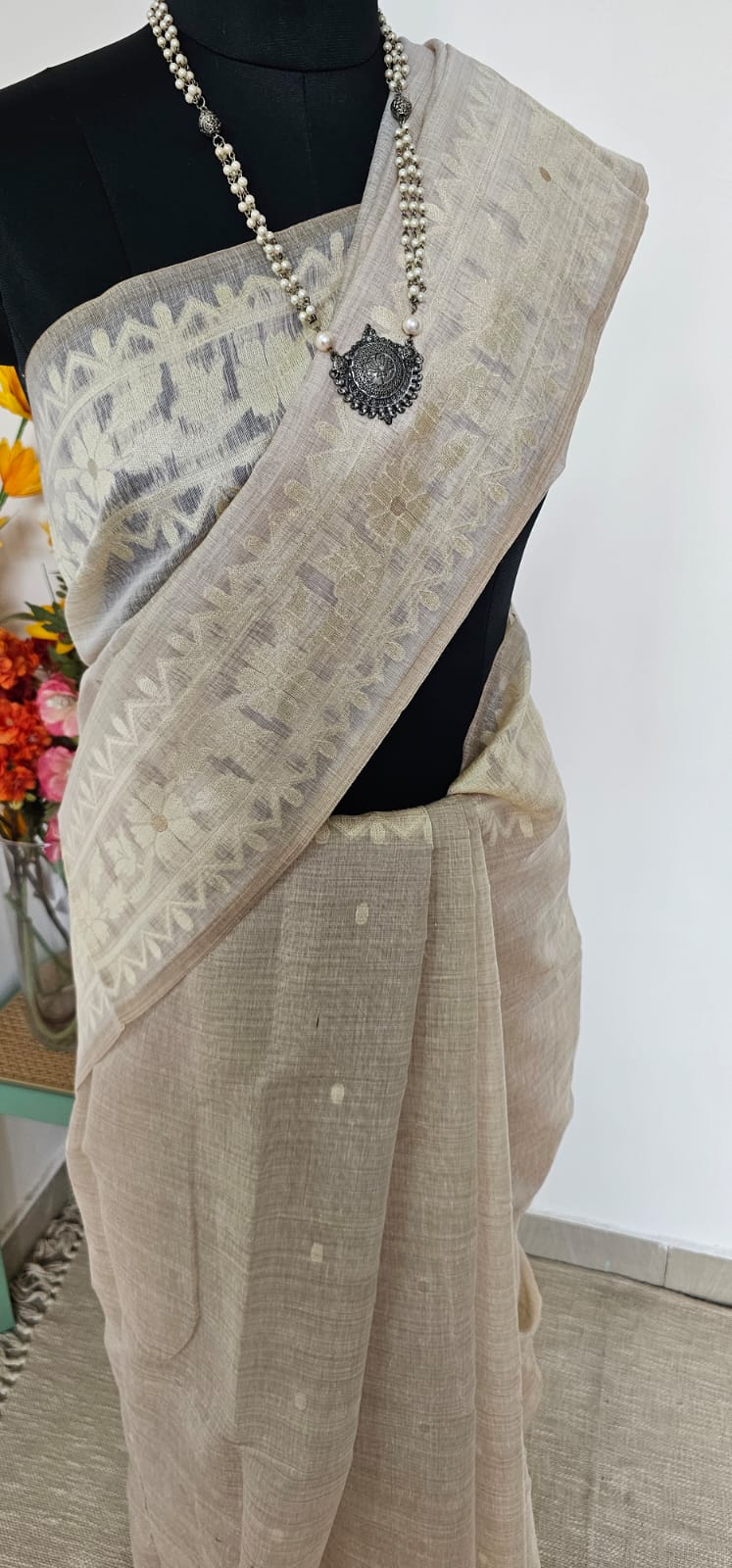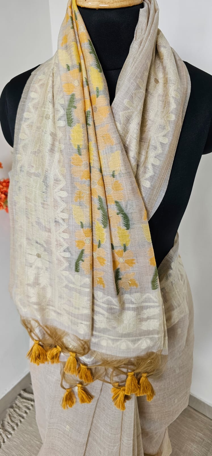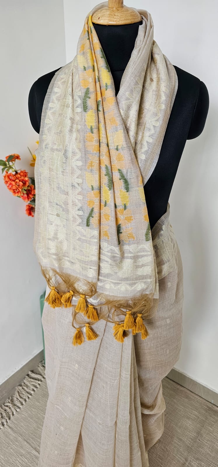 Grace meets simplicity in our Pushpavalli Munga Cotton Saree, a soft handwoven cotton drape in a soothing beige tone adorned with delicate yellow floral motifs. The subtle geometric borders add structure, while the scattered blossoms across the pallu bring a refreshing charm. Mustard tassels at the edge complete the look with a playful finish.