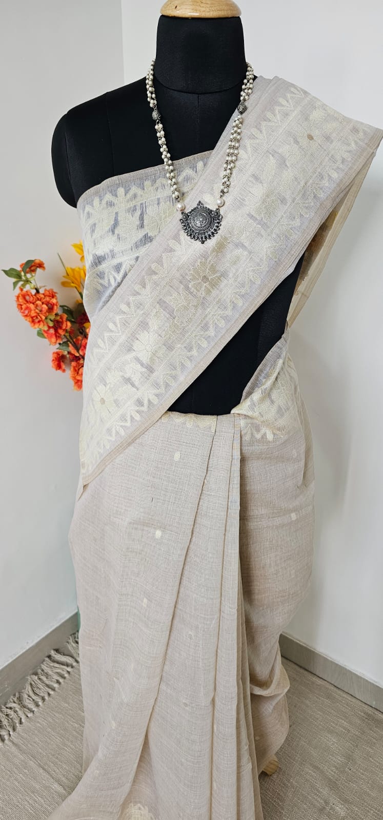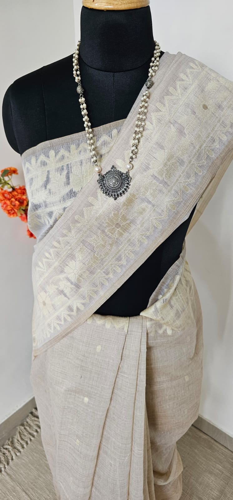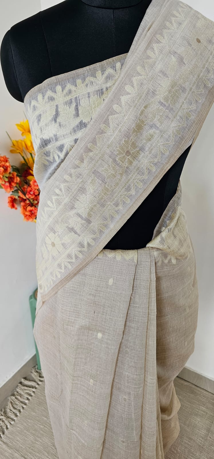 Grace meets simplicity in our Pushpavalli Munga Cotton Saree, a soft handwoven cotton drape in a soothing beige tone adorned with delicate yellow floral motifs. The subtle geometric borders add structure, while the scattered blossoms across the pallu bring a refreshing charm. Mustard tassels at the edge complete the look with a playful finish.