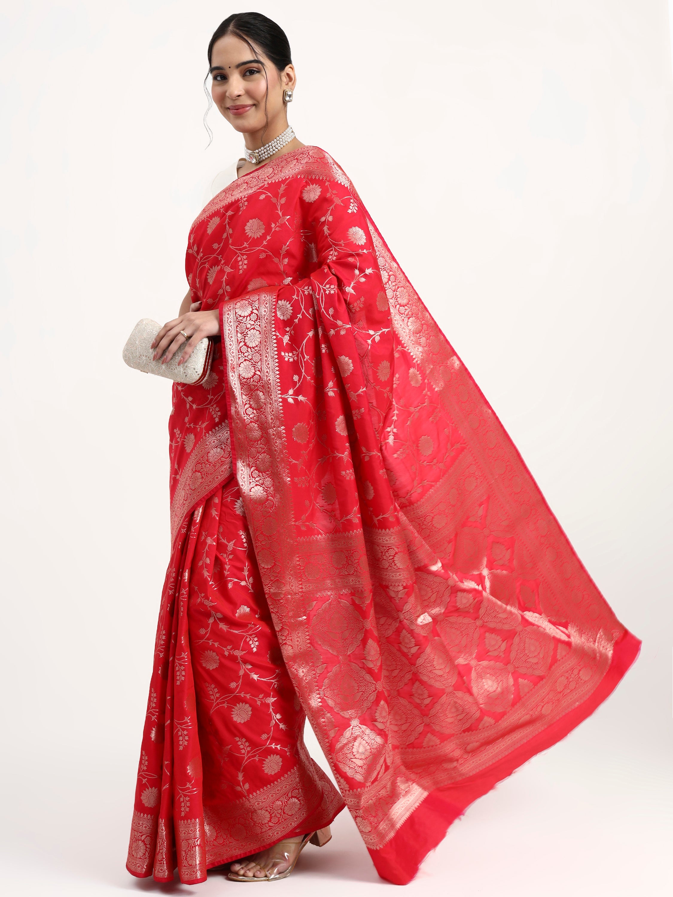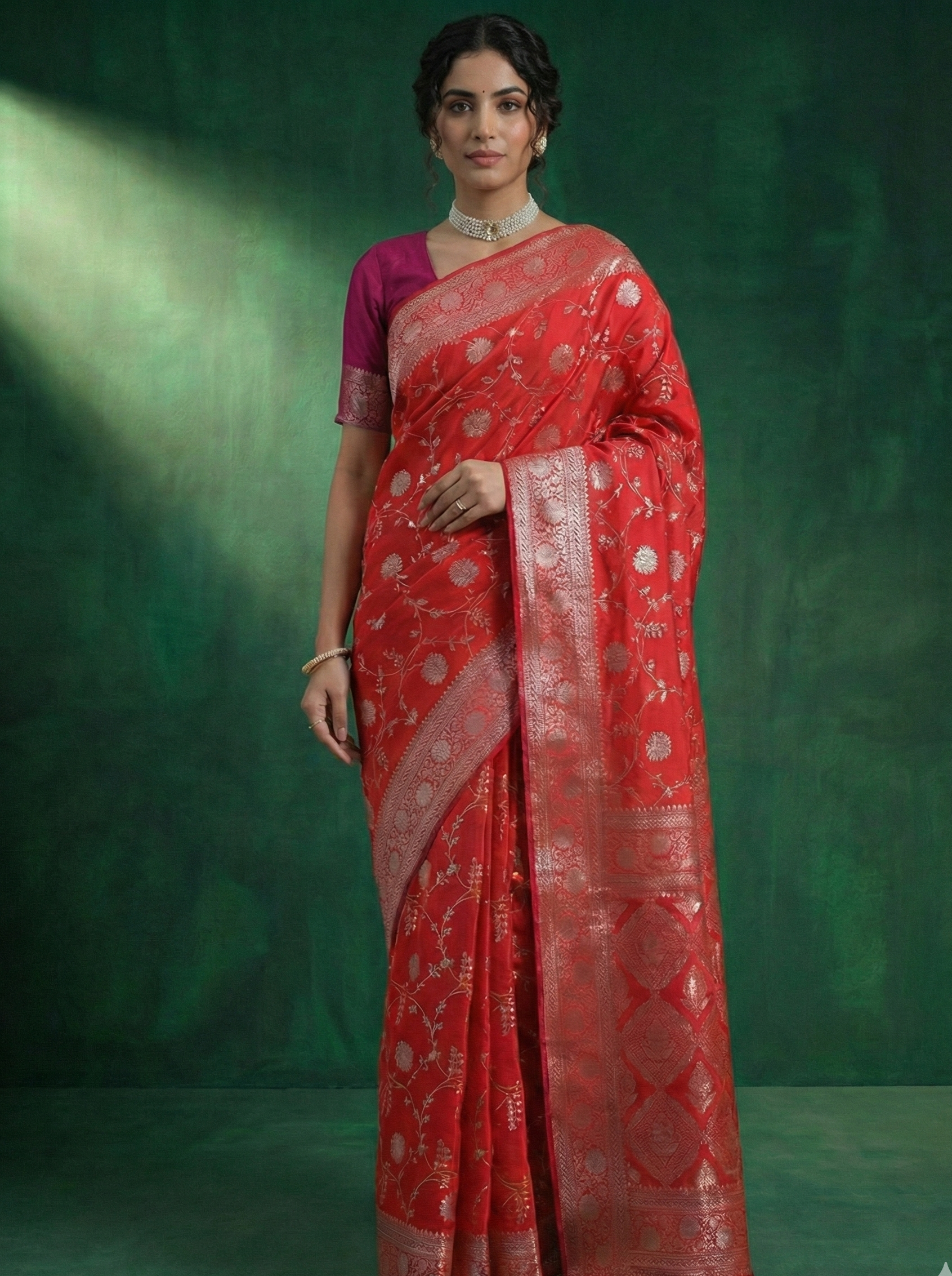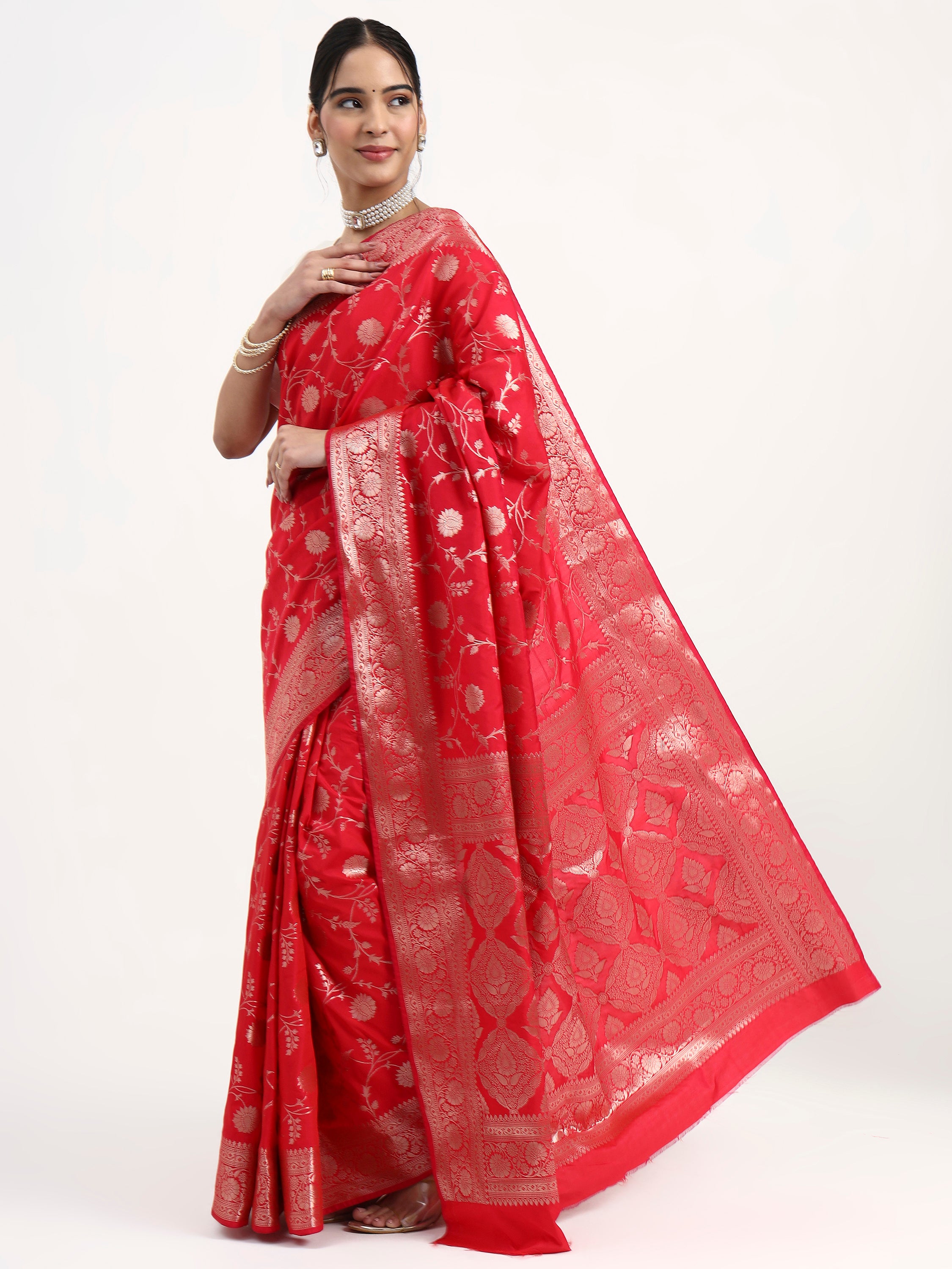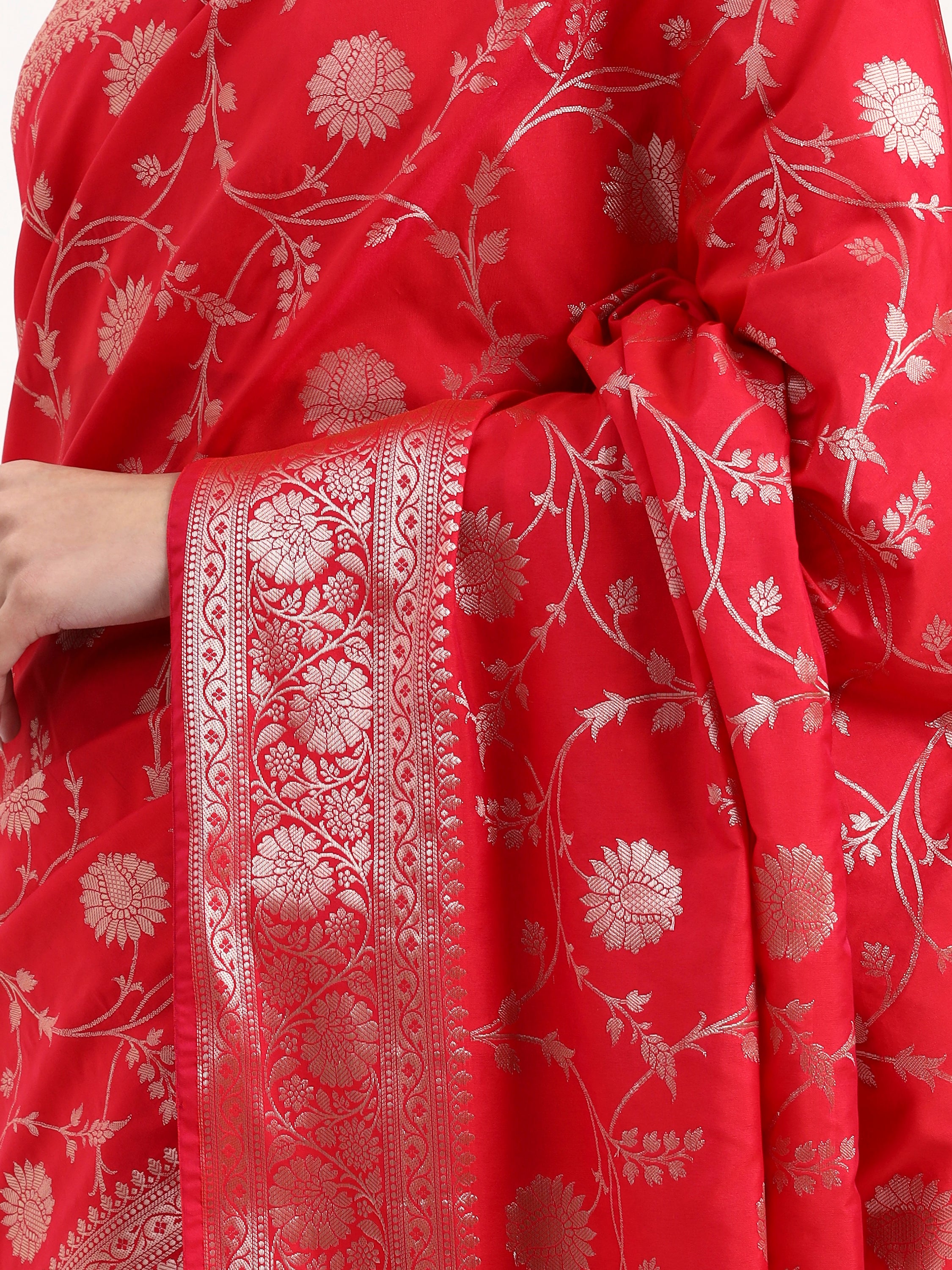 This saree carries shakti's sacred power—red represents divine feminine energy, auspicious celebrations, and the life force itself. The color of kumkum and sacred commitment, this is the hue worn at Vrindavan's most auspicious moments. The delicate silver zari motifs scattered across the body shimmer like blessings, while the rich border with traditional weaving completes this timeless masterpiece.