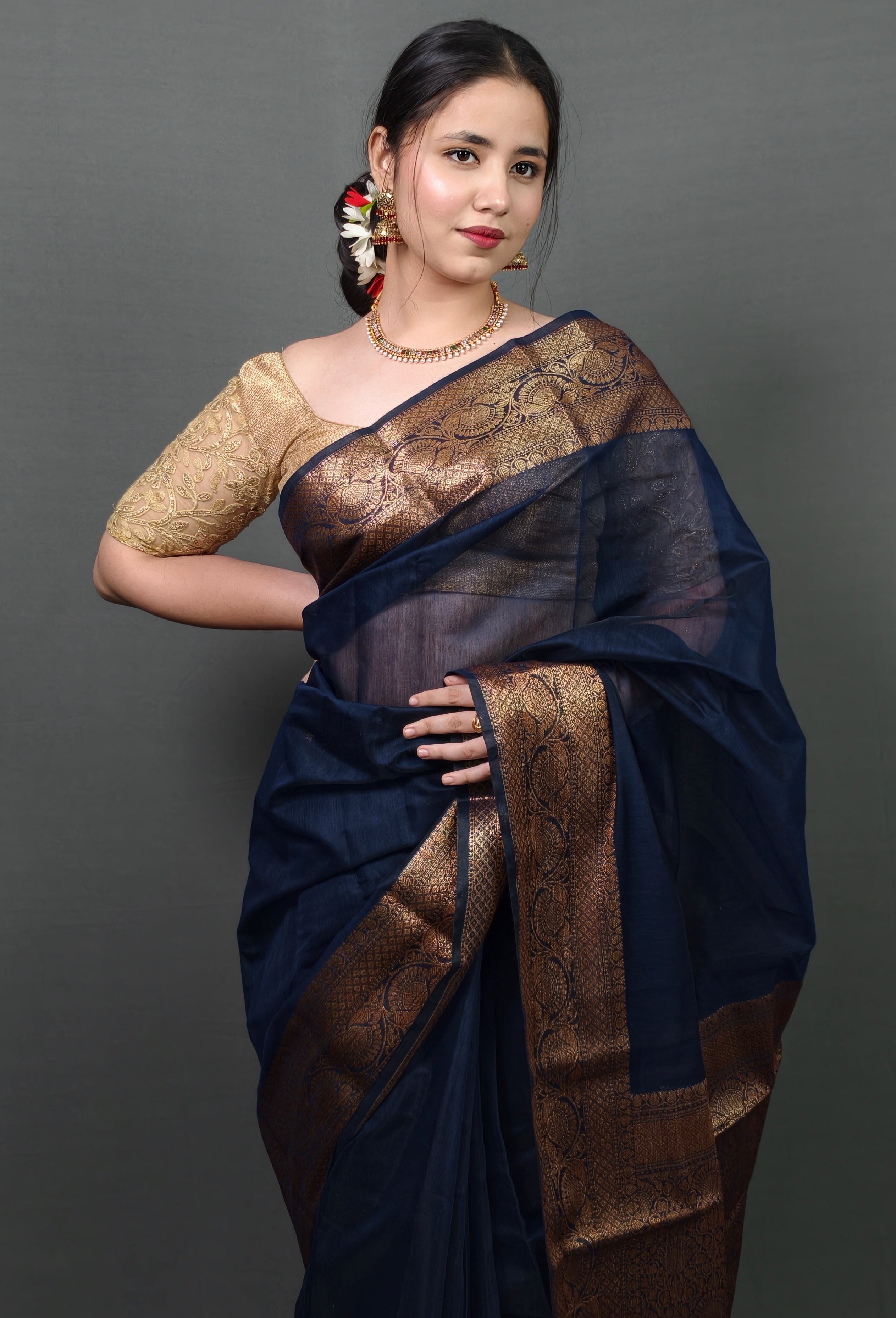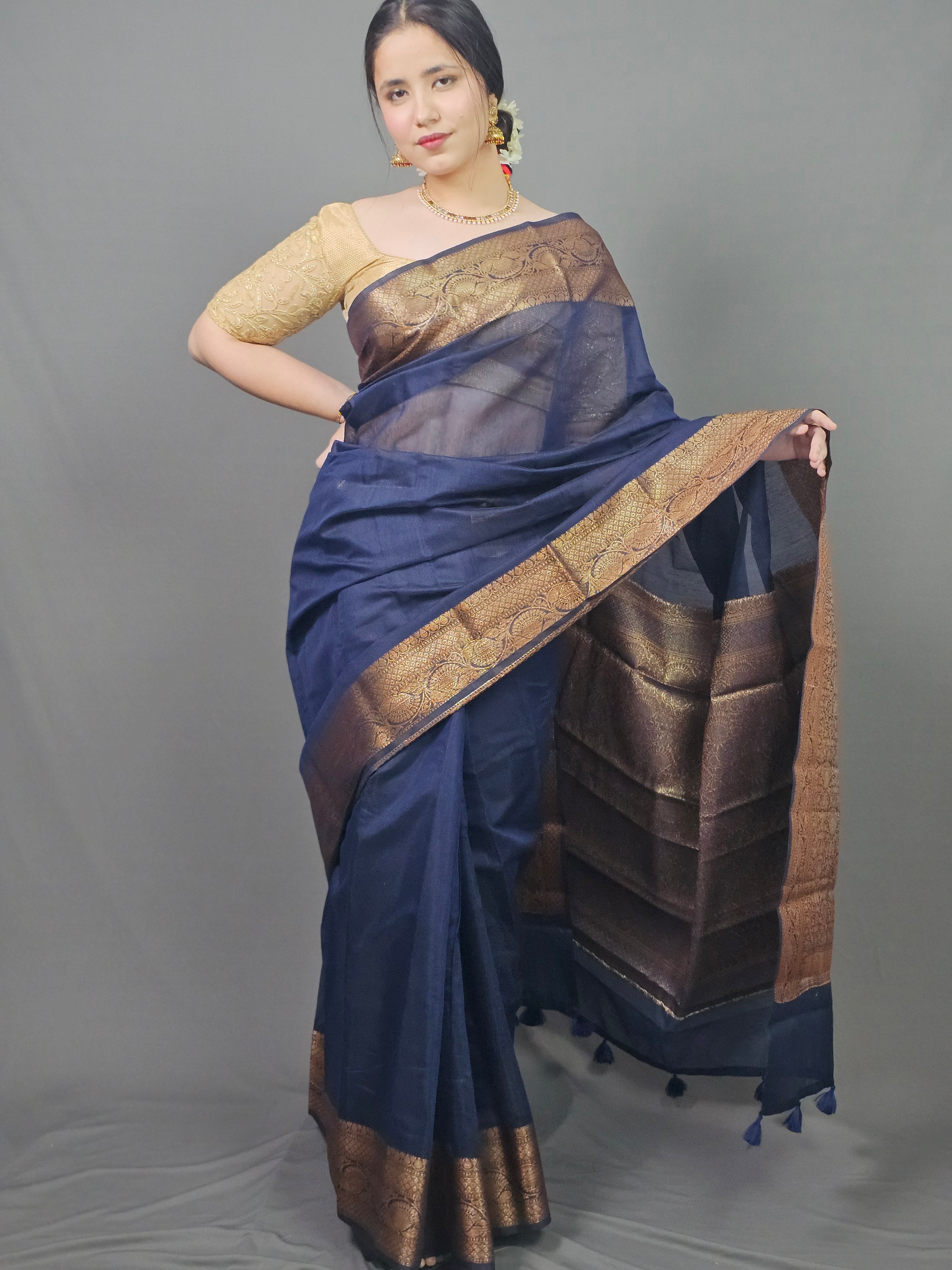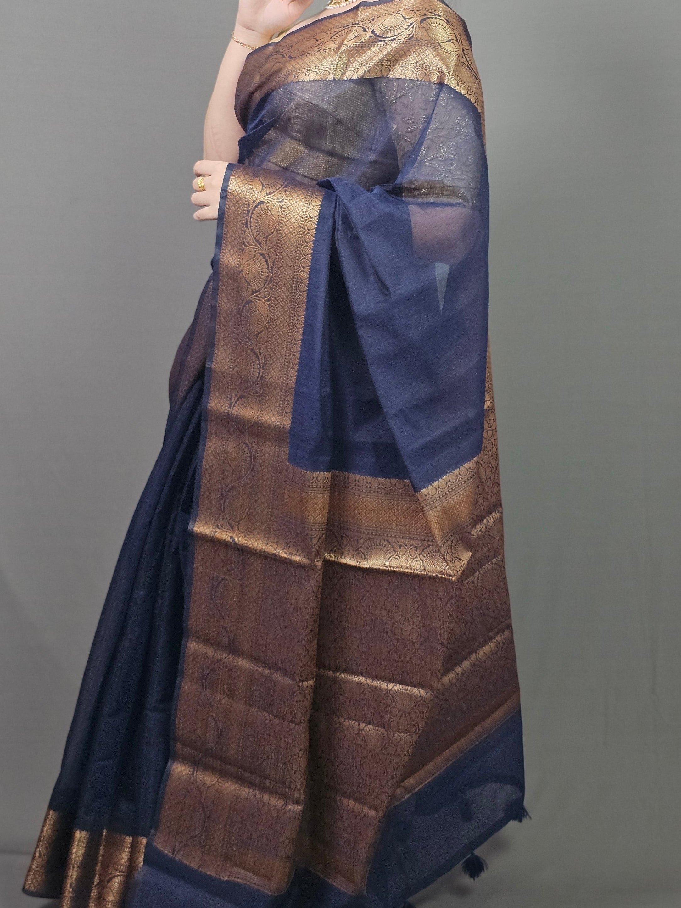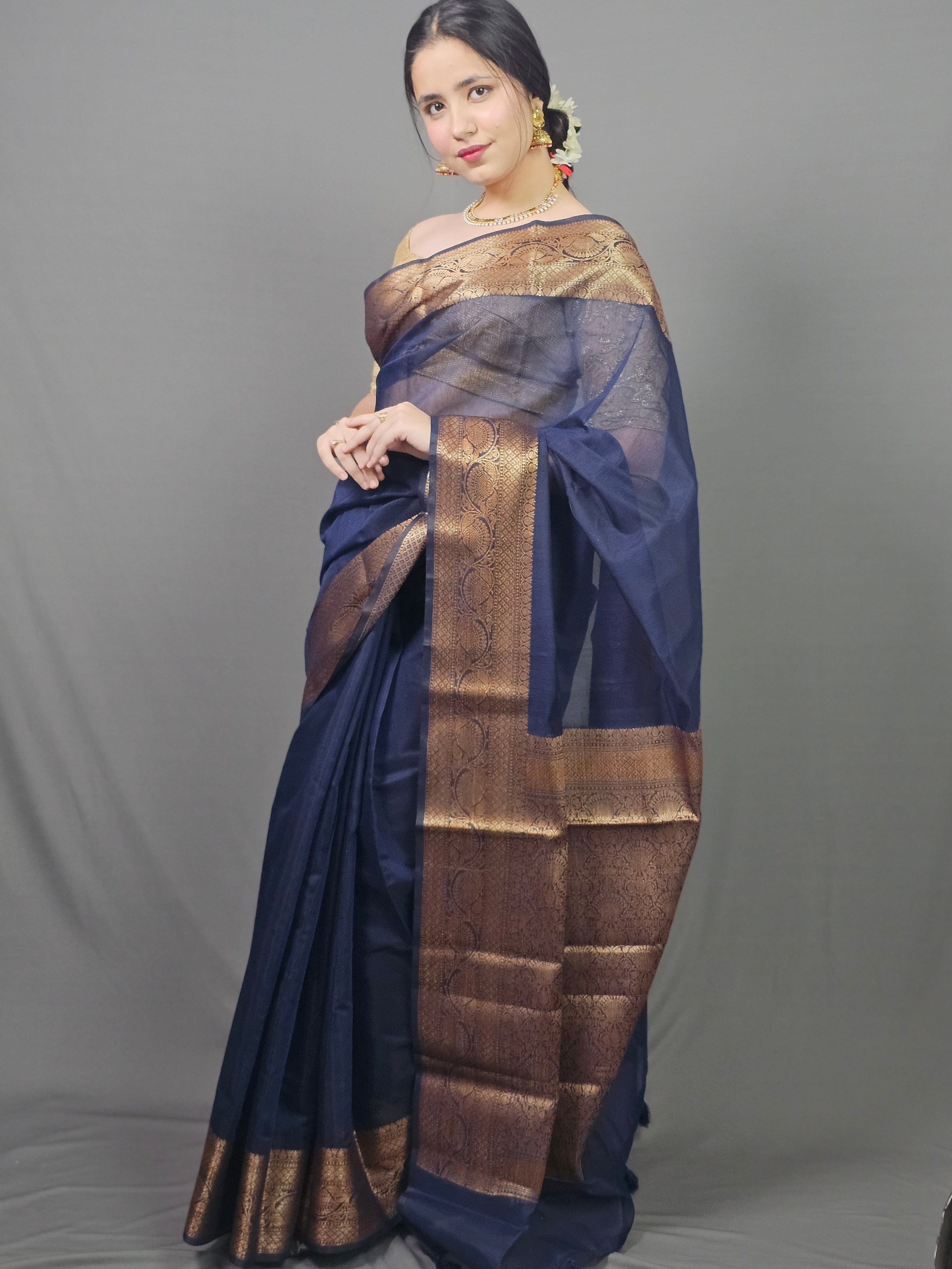 Pure silk blend drapes like liquid midnight, lightweight yet luxurious with graceful flow. The deep navy body creates a sophisticated, timeless canvas, while the wide enriched gold zari border and pallu showcase intricate Banarasi craftsmanship—traditional patterns woven with devotional artistry. Semi-sheer fabric adds subtle depth and dimension, perfect for occasions that demand both elegance and commanding presence.