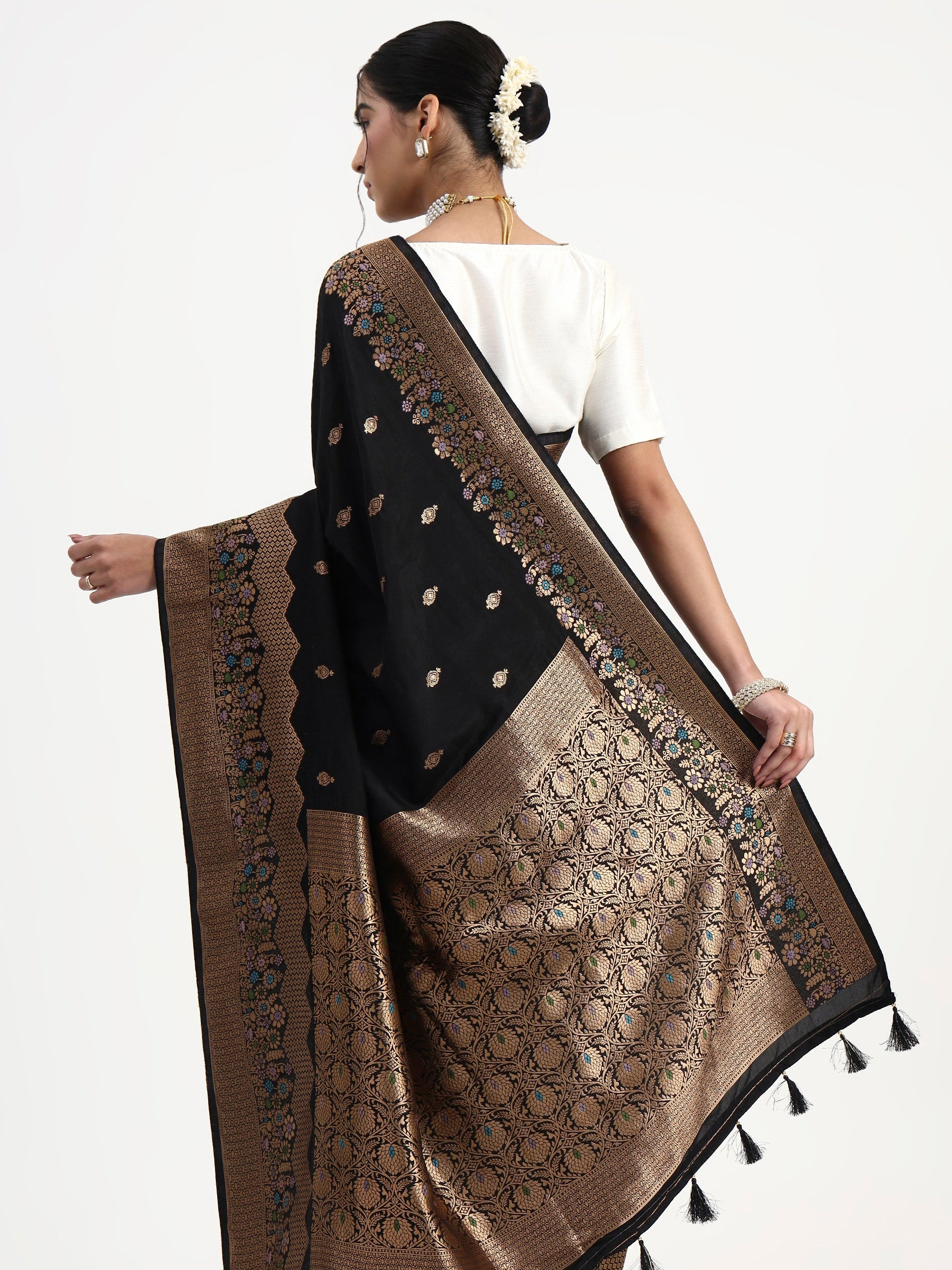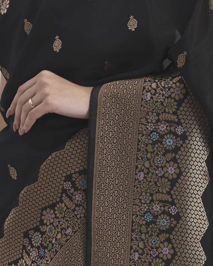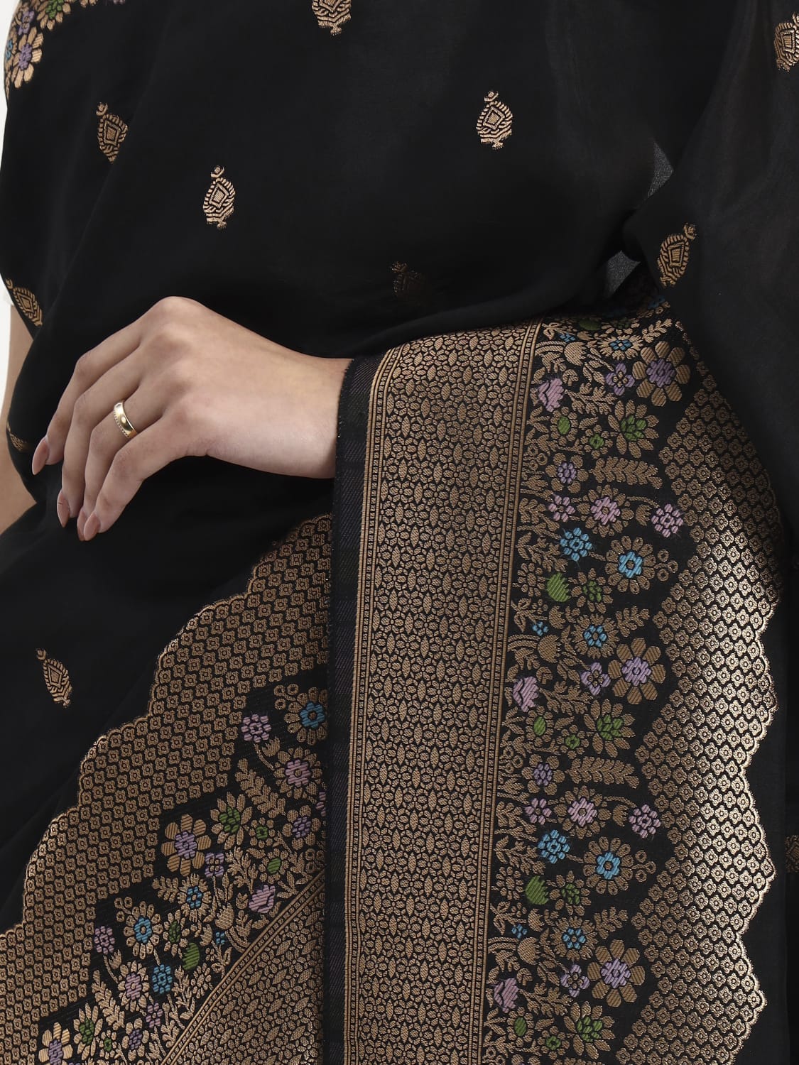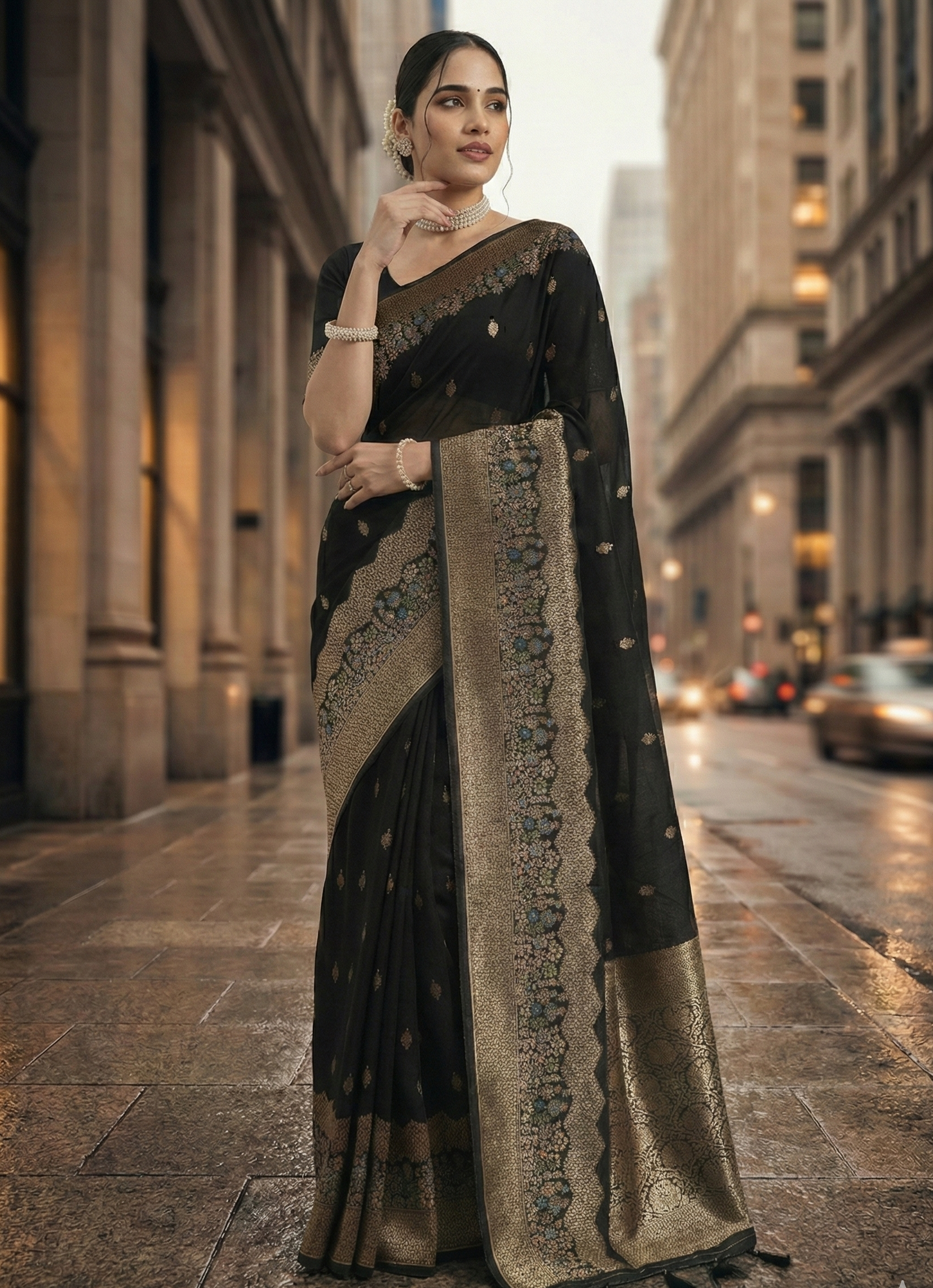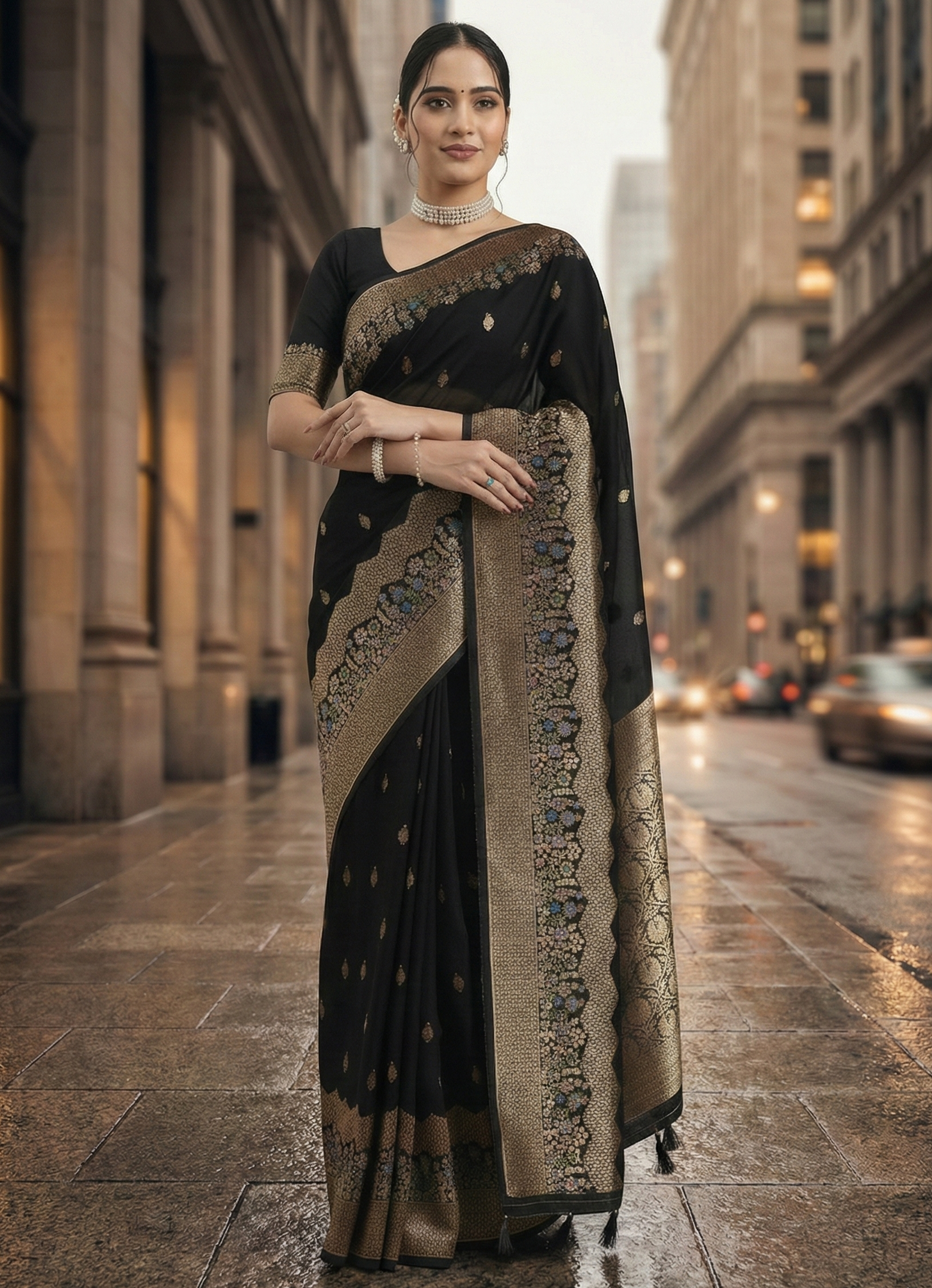 This saree embodies profound mystery—black represents the infinite void from which all creation emerges, divine consciousness itself, and Kali's protective...