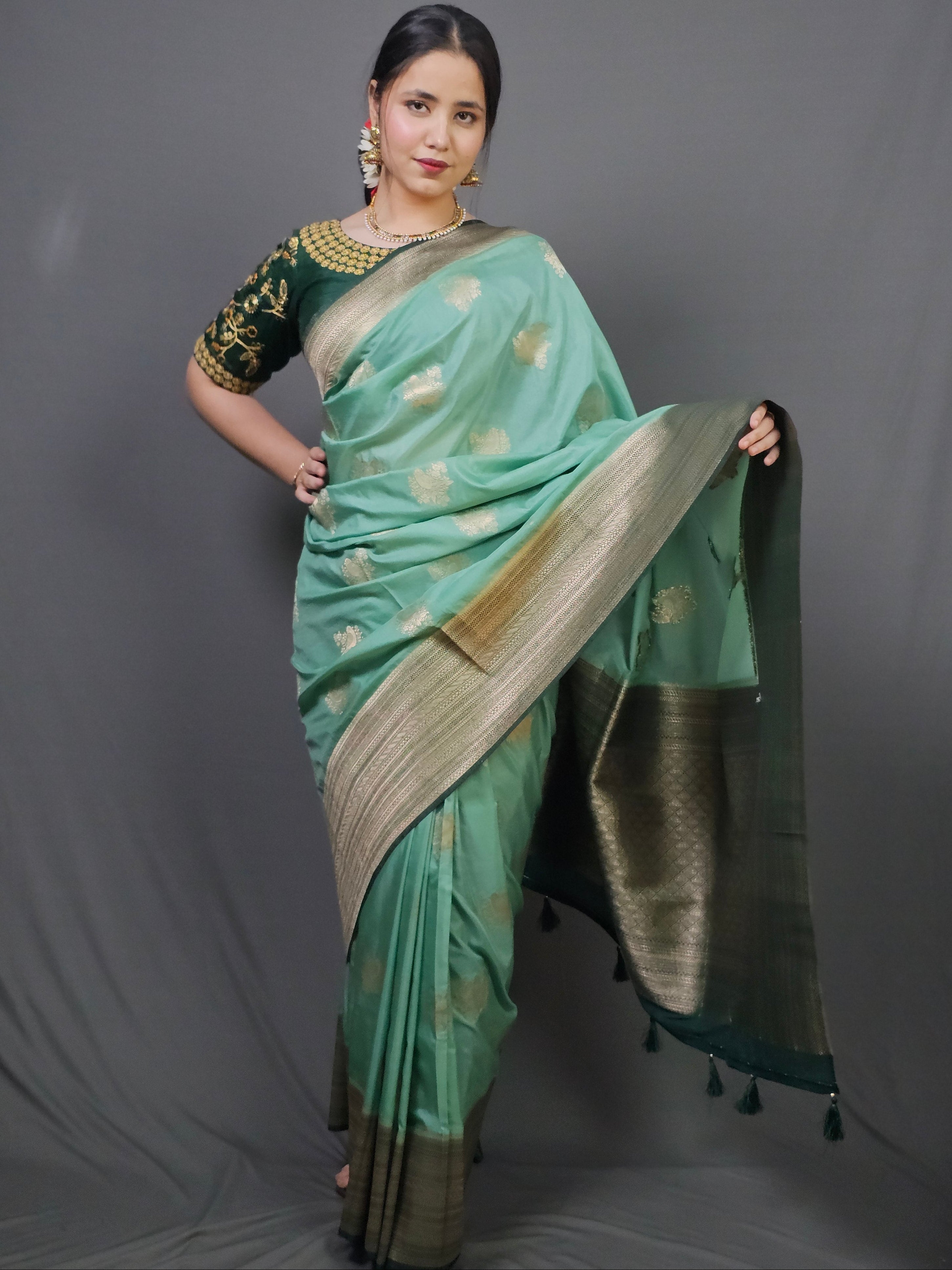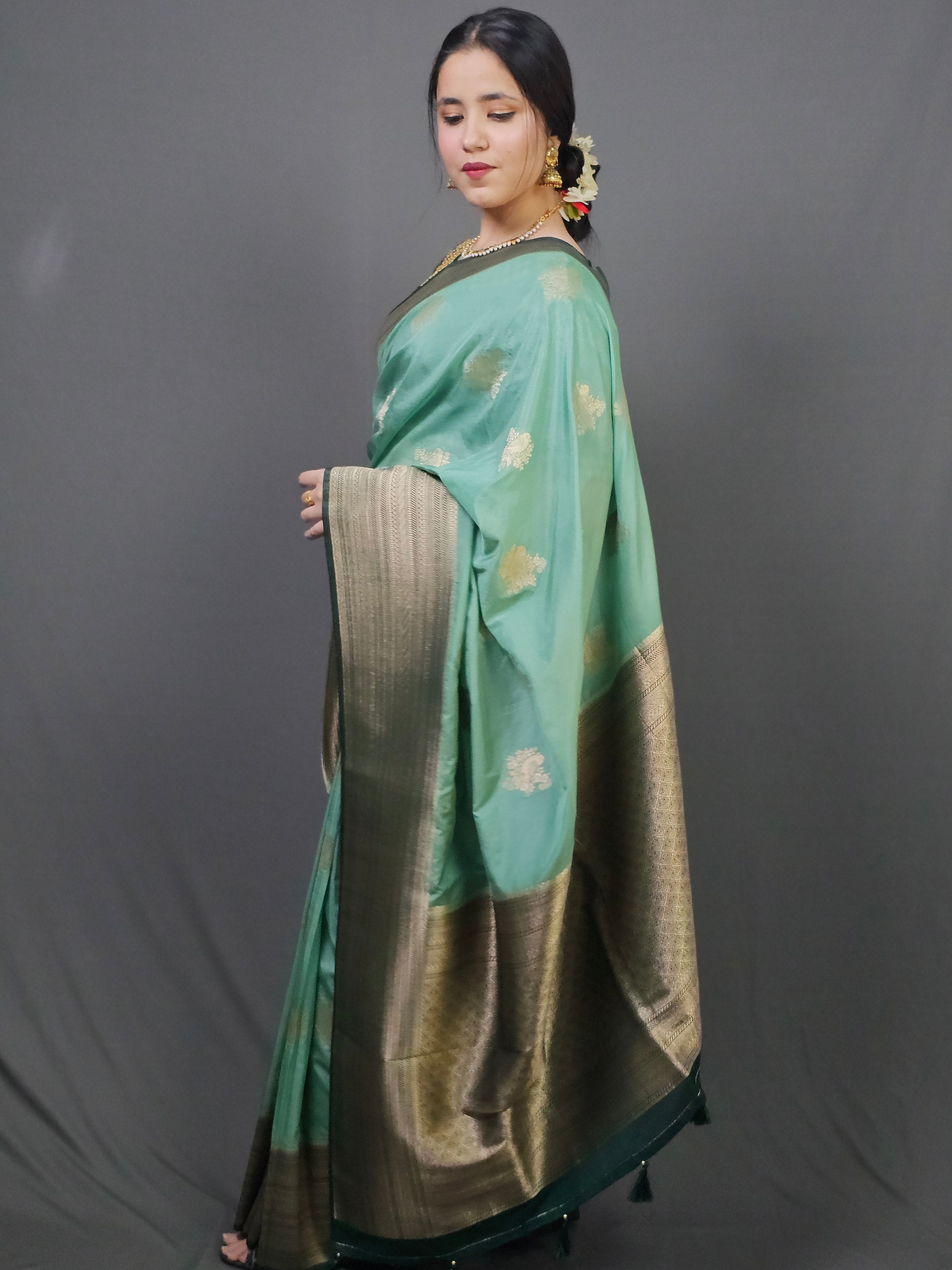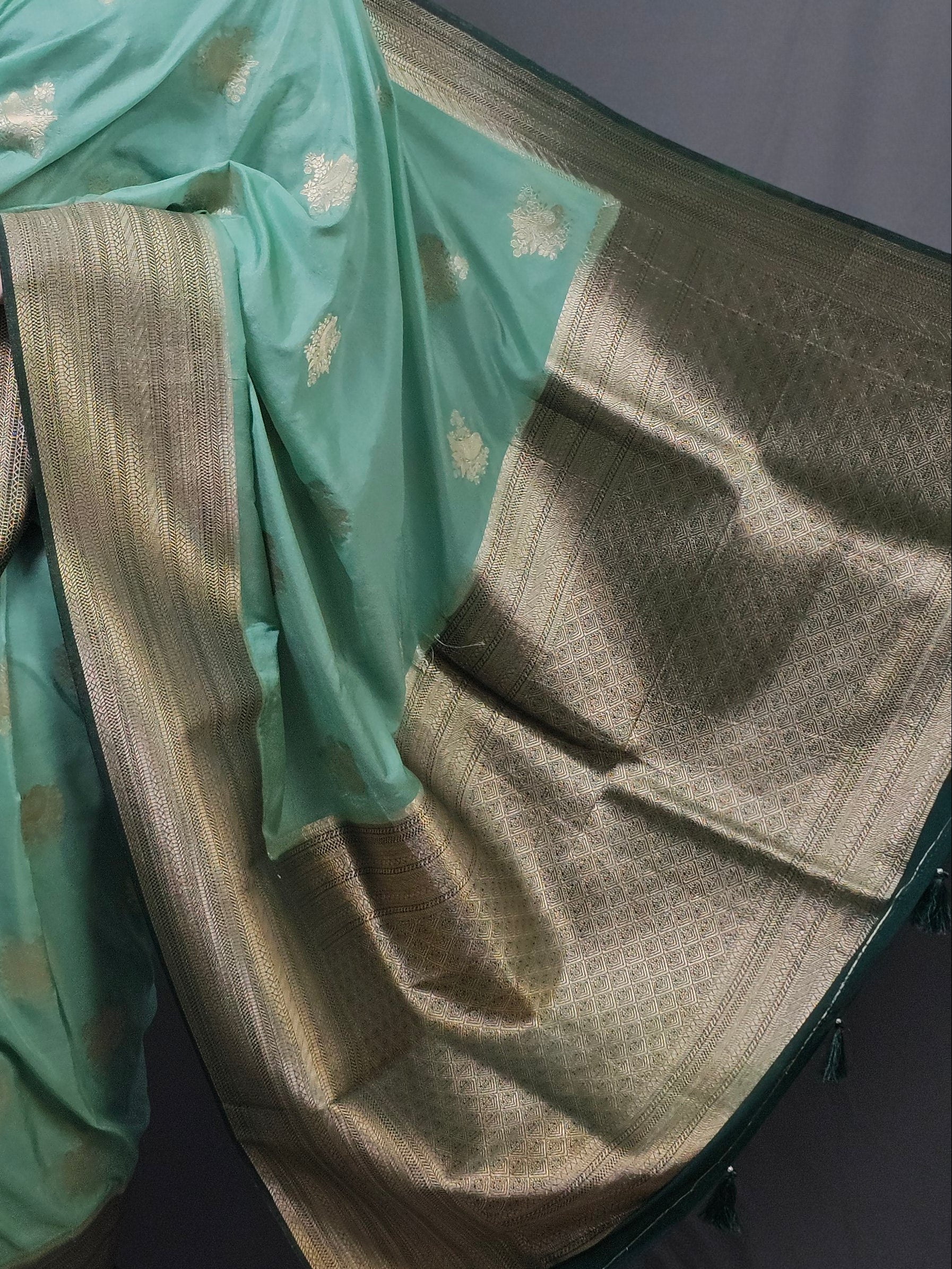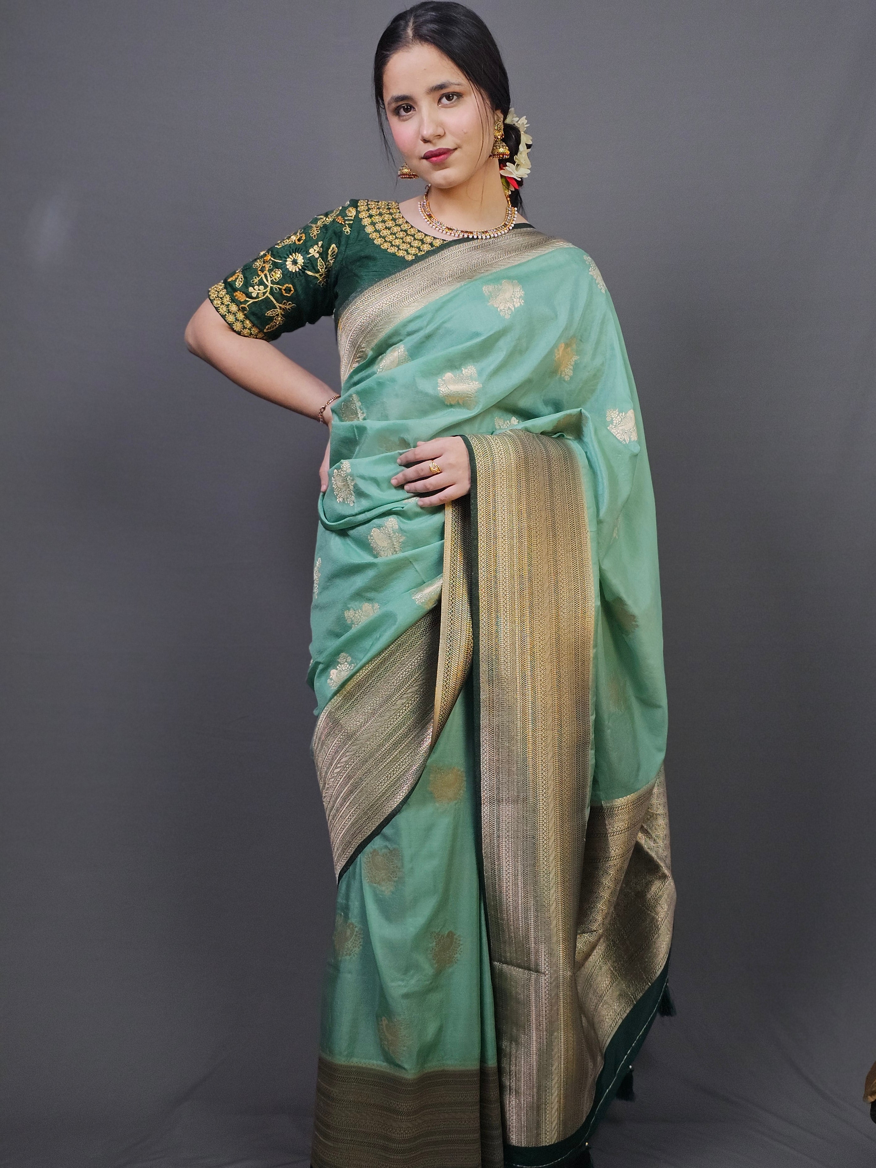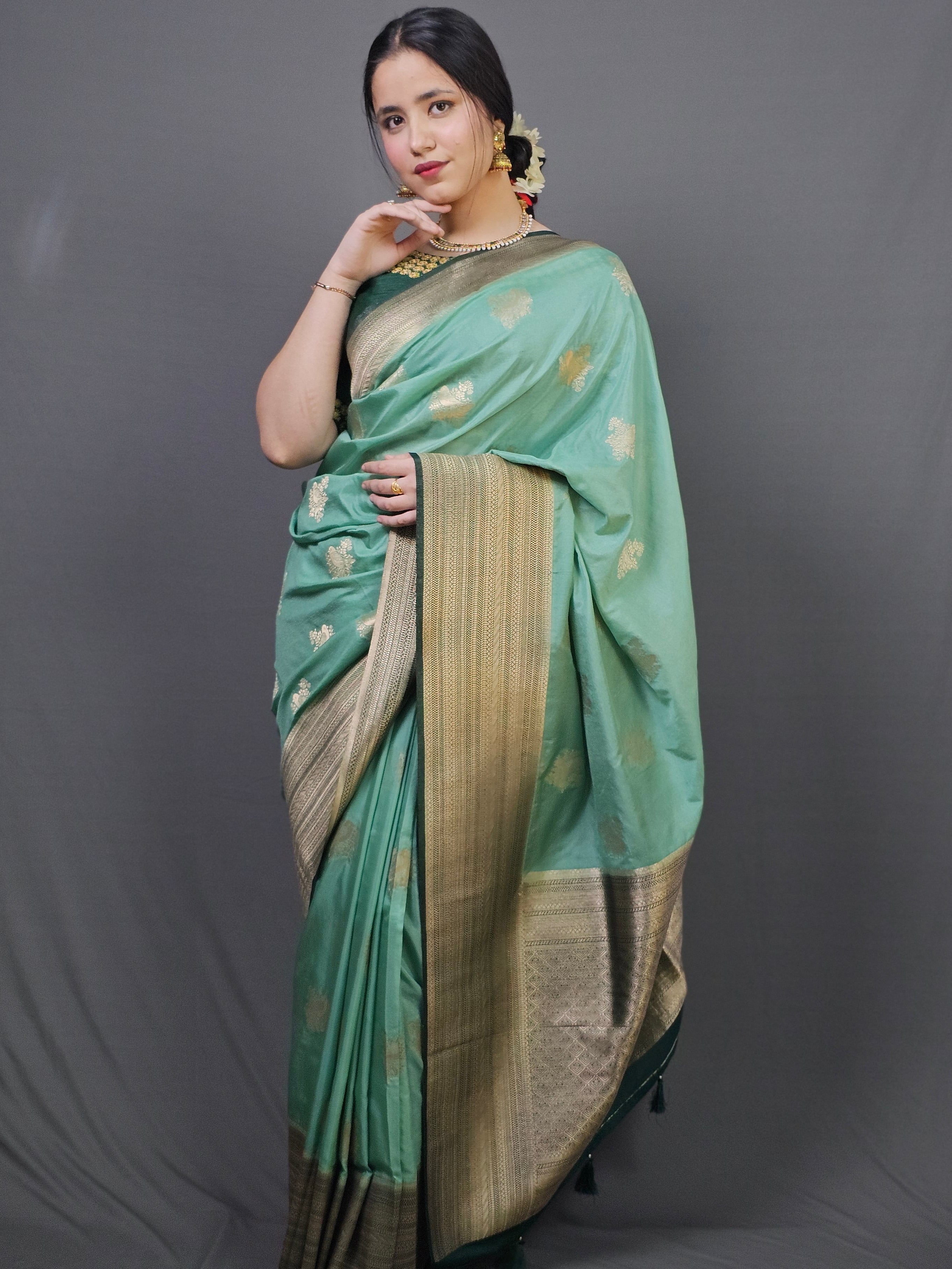 Pure silk blend drapes like flowing water, lightweight and graceful with effortless movement. The luminous turquoise body features delicate gold buti motifs scattered like dewdrops, while the enriched gold zari border and pallu showcase intricate Banarasi craftsmanship. Semi-sheer fabric creates an ethereal, luminous quality—each fold catching light differently. The contrast between the soft turquoise and the deep gold work creates sophisticated traditional elegance.
