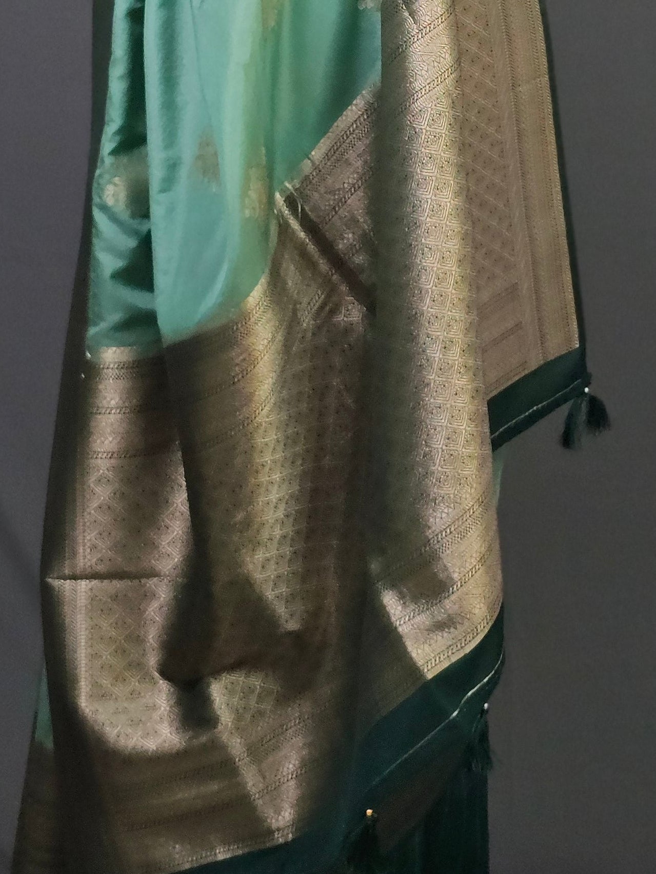 This saree reflects nature's eternal abundance—turquoise green carries the serenity of sacred waters, the harmony of temple gardens, and the peaceful energy of Vrindavan's divine landscapes. Like the Yamuna at dawn, this color embodies tranquility, growth, and spiritual balance. The rich gold zari border and pallu mirror sunlight dancing on water, creating an elegant interplay of earth and celestial gold.