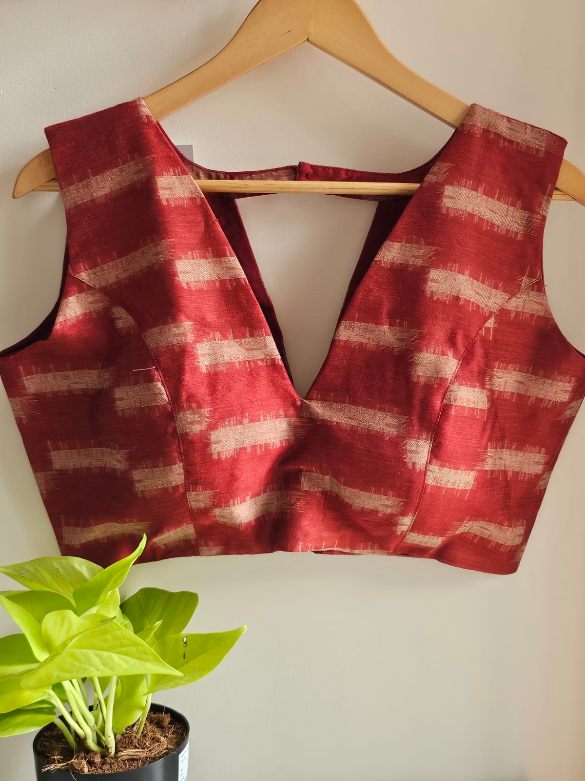 This striking blouse is crafted from luxurious handwoven silk cotton, featuring soft gold woven stripes over a deep vermilion red...