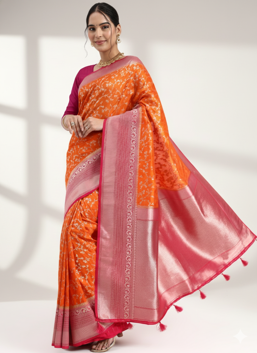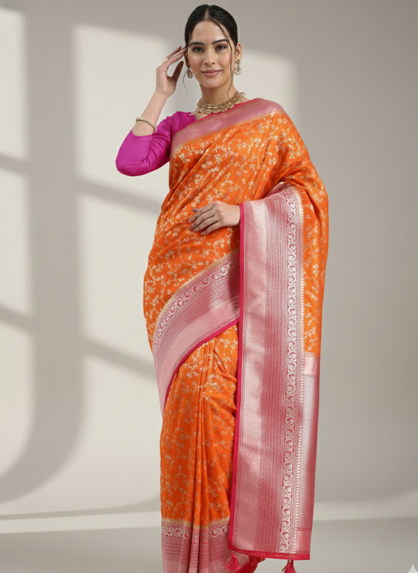 This saree carries the sacred flame—vibrant orange represents spiritual fire, auspicious celebrations, and the warm glow of devotional joy. In Vrindavan, this is the color of sunrise over the Yamuna, when the first rays illuminate Krishna's temples. The delicate silver zari florals dance across the body like offerings scattered in celebration, while the rich pink border adds divine tenderness.